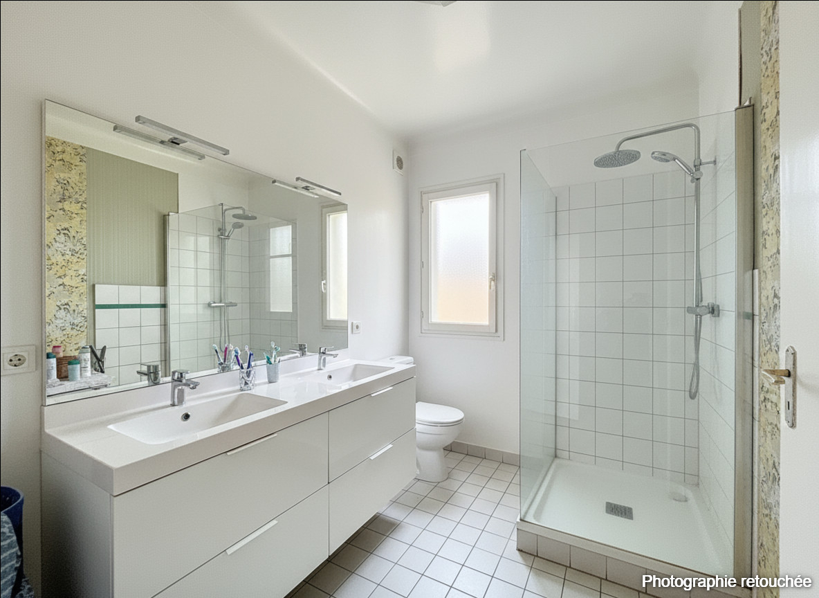 Elle se compose d'une entrée desservant un double séjour lumineux, d'une cuisine séparée avec son cellier attenant, de quatre chambres confortables, d'une salle d'eau et de WC indépendants.