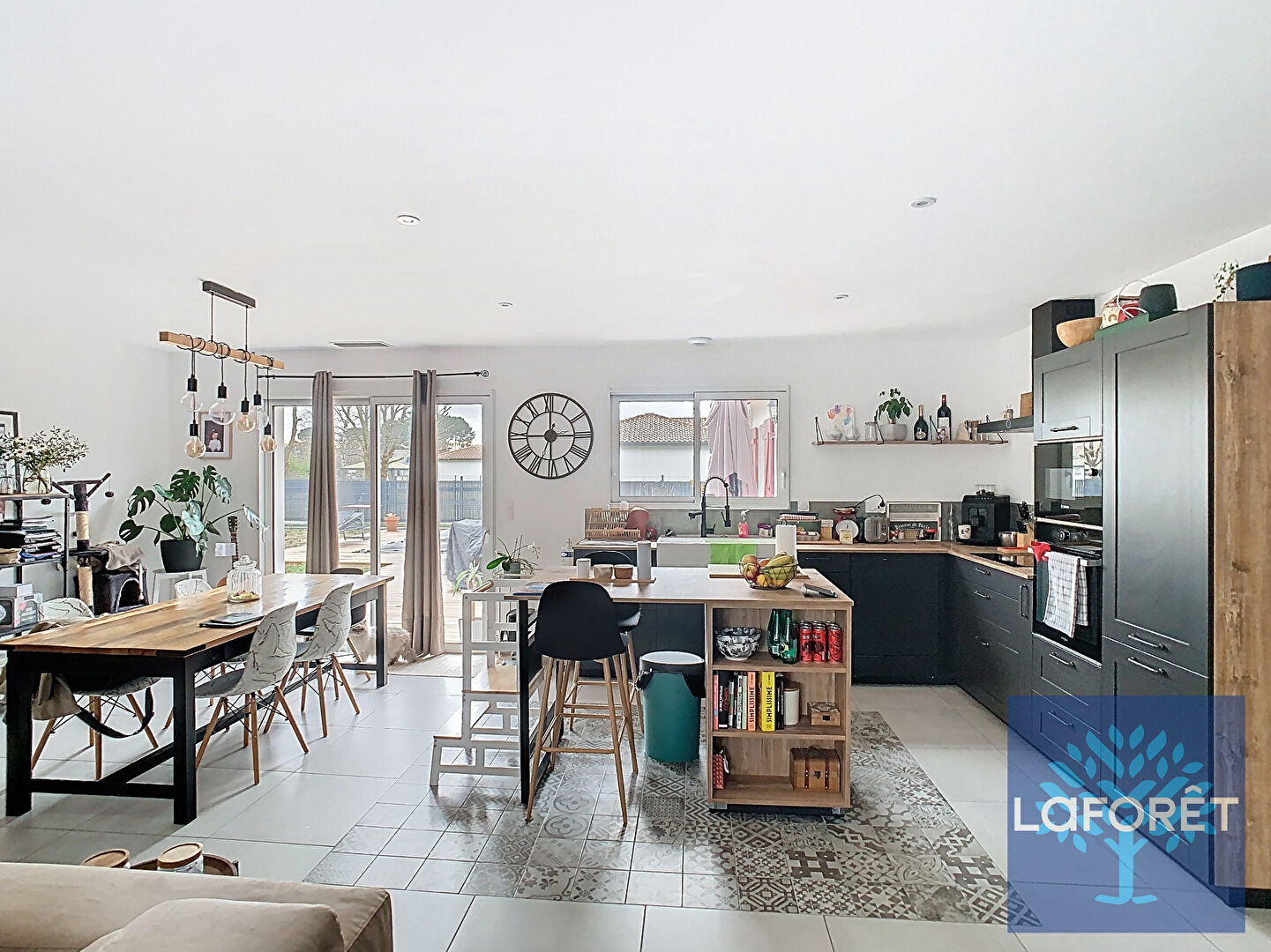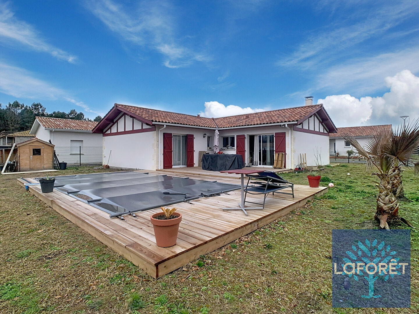 Un jardin et une superbe terrasse en bois avec piscine complète cette maison.