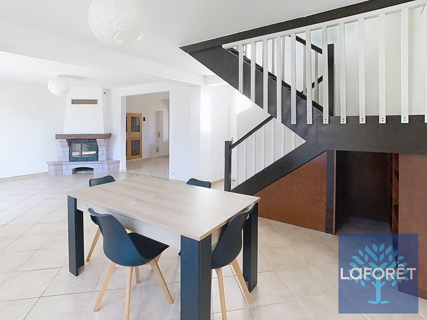 Maison T5 de 117m² comprenant au rez-de-chaussée un salon, une salle à manger, une cuisine aménagée et équipée, une chambre, une salle de bain et un WC séparé.