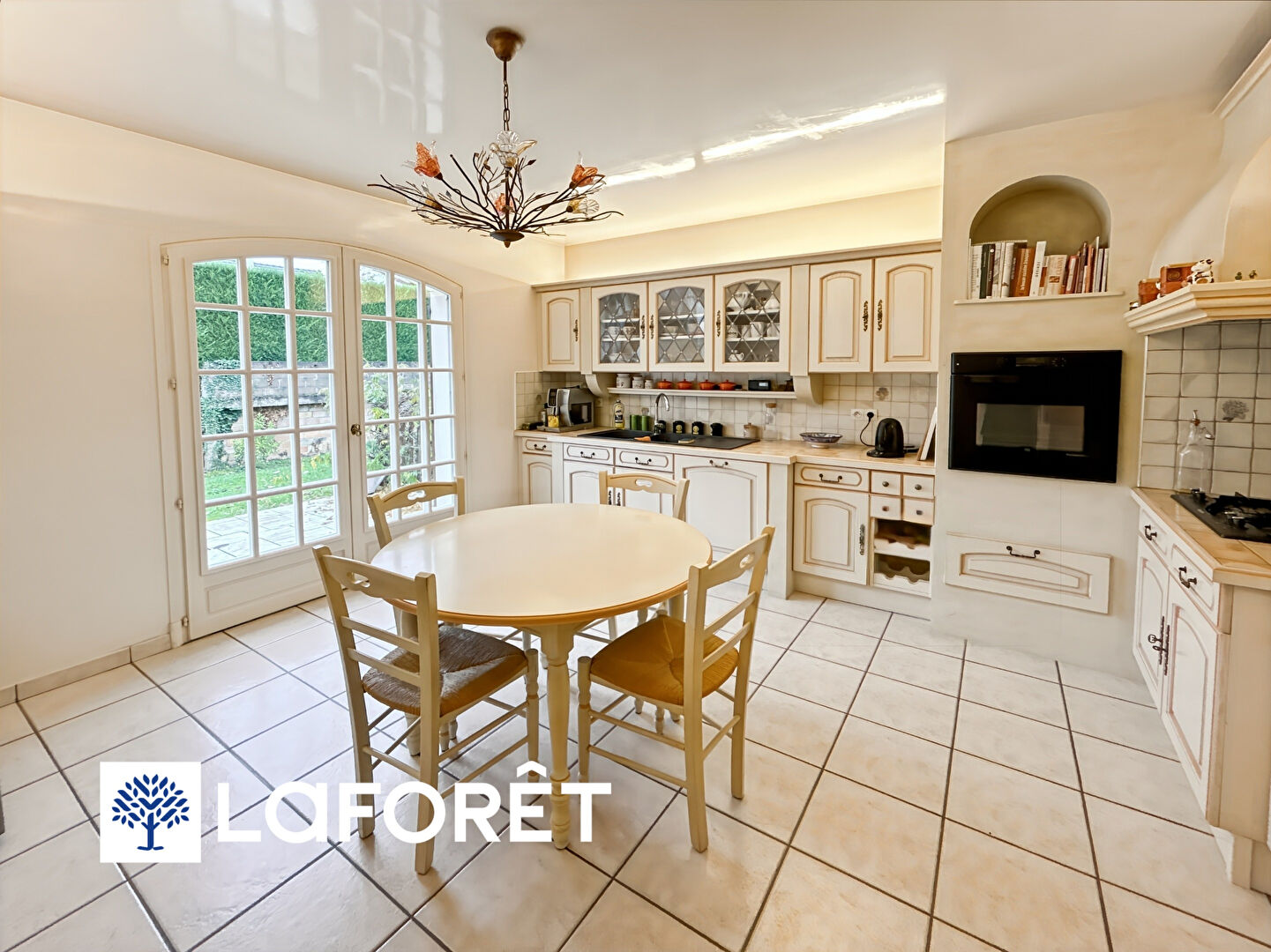 La cuisine indépendante, fonctionnelle et tournée vers le jardin, permet un accès direct à la terrasse, idéale pour profiter des beaux jours.