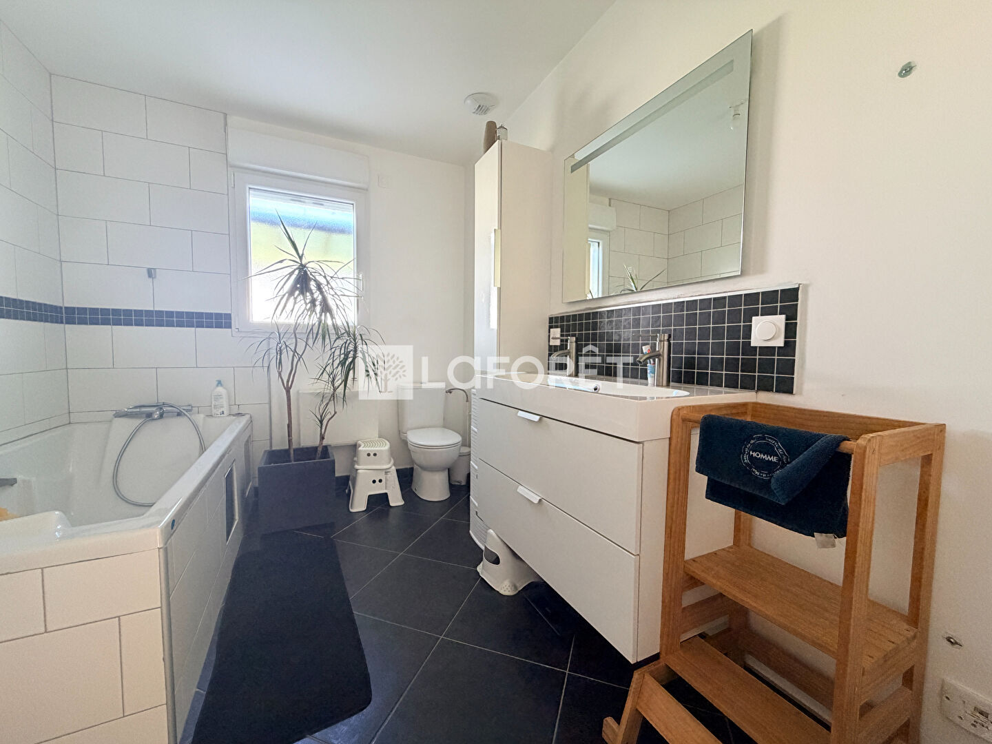 Une salle de bains avec baignoire et WC ainsi qu'un second WC indépendant complètent l'ensemble.