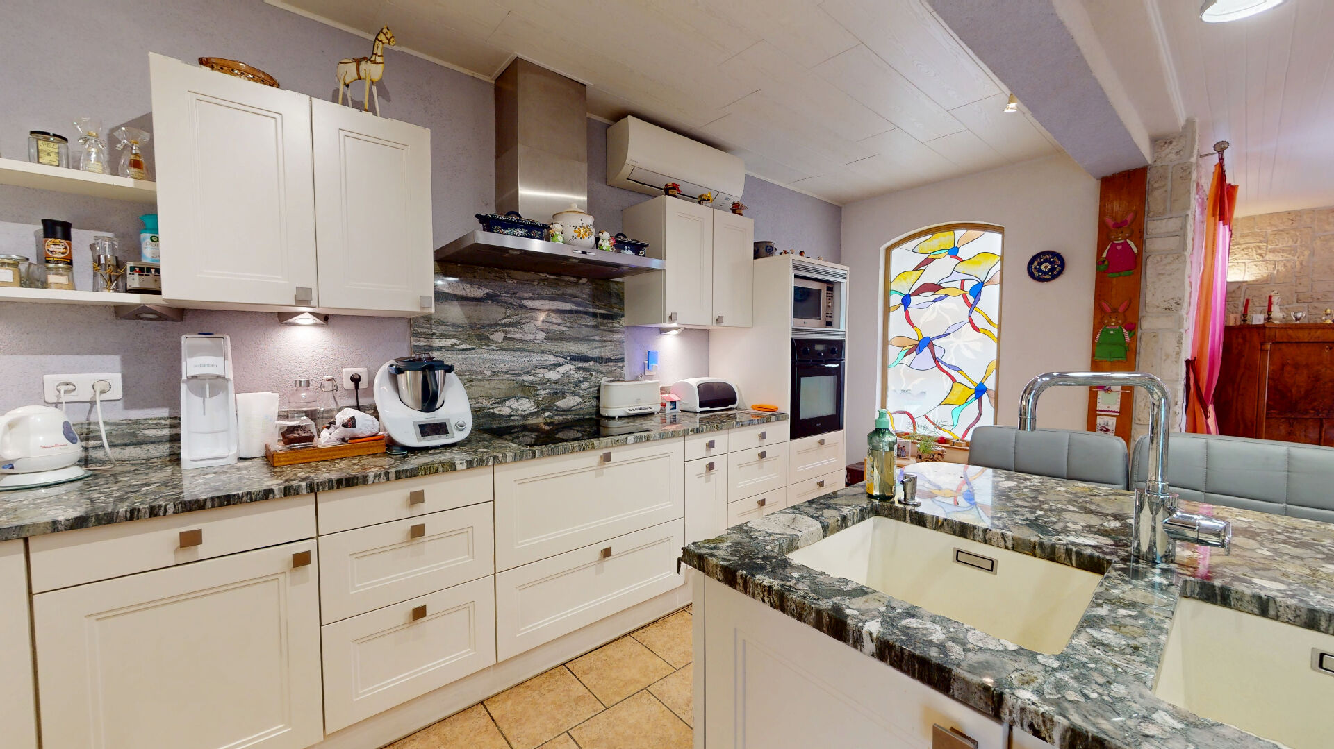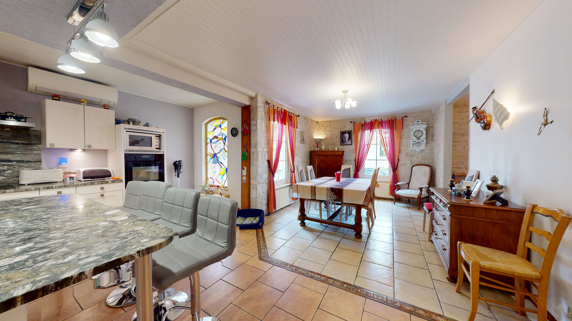 Dès l'entrée, le rez-de-chaussée s'organise autour d'un espace de vie traversant d'environ 70 m². La cuisine ouverte, réalisée avec des matériaux de qualité, structure l'ensemble et dessert une extension baignée de lumière, accueillant un salon avec accès direct à la terrasse.