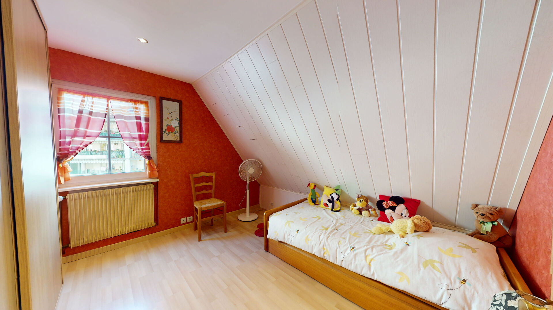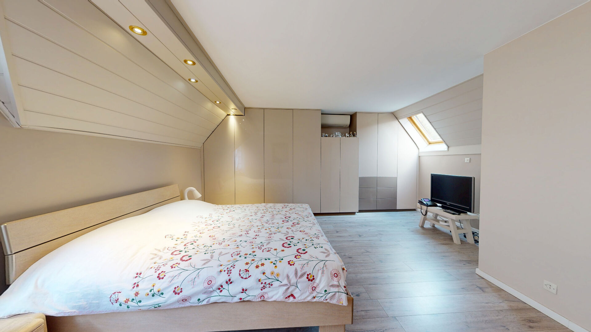 À l'étage, vous trouverez 4 chambres. La chambre principale, d'environ 21 m², dispose de rangements sur mesure et d'un système de climatisation. Une seconde salle de bains peut être aménagée en remplacement de l'une des chambres selon les besoins.