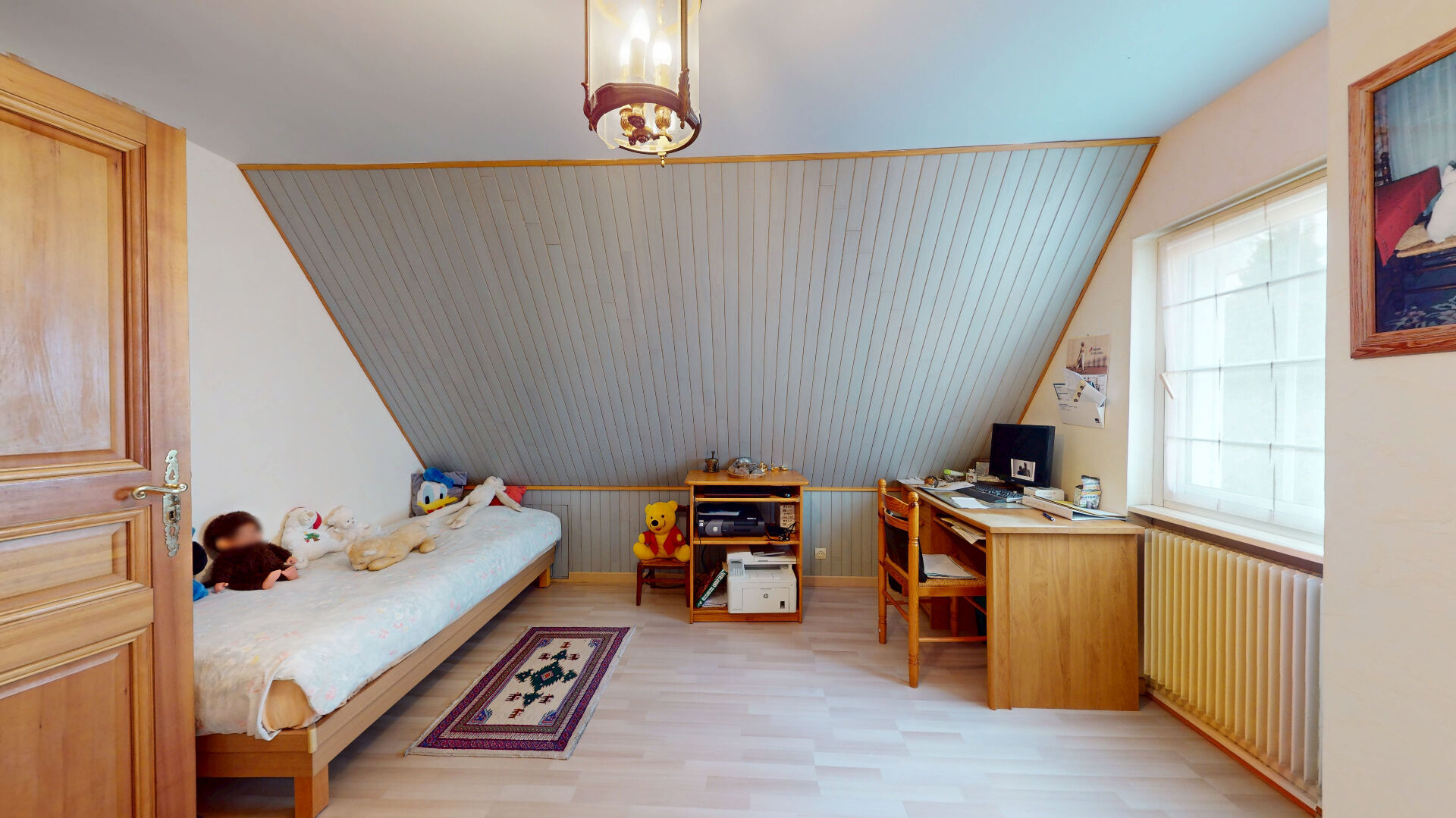 Une pièce adjacente de 13 m² peut faire office de bureau ou de chambre. Une salle de bains et un WC séparé complètent ce niveau.