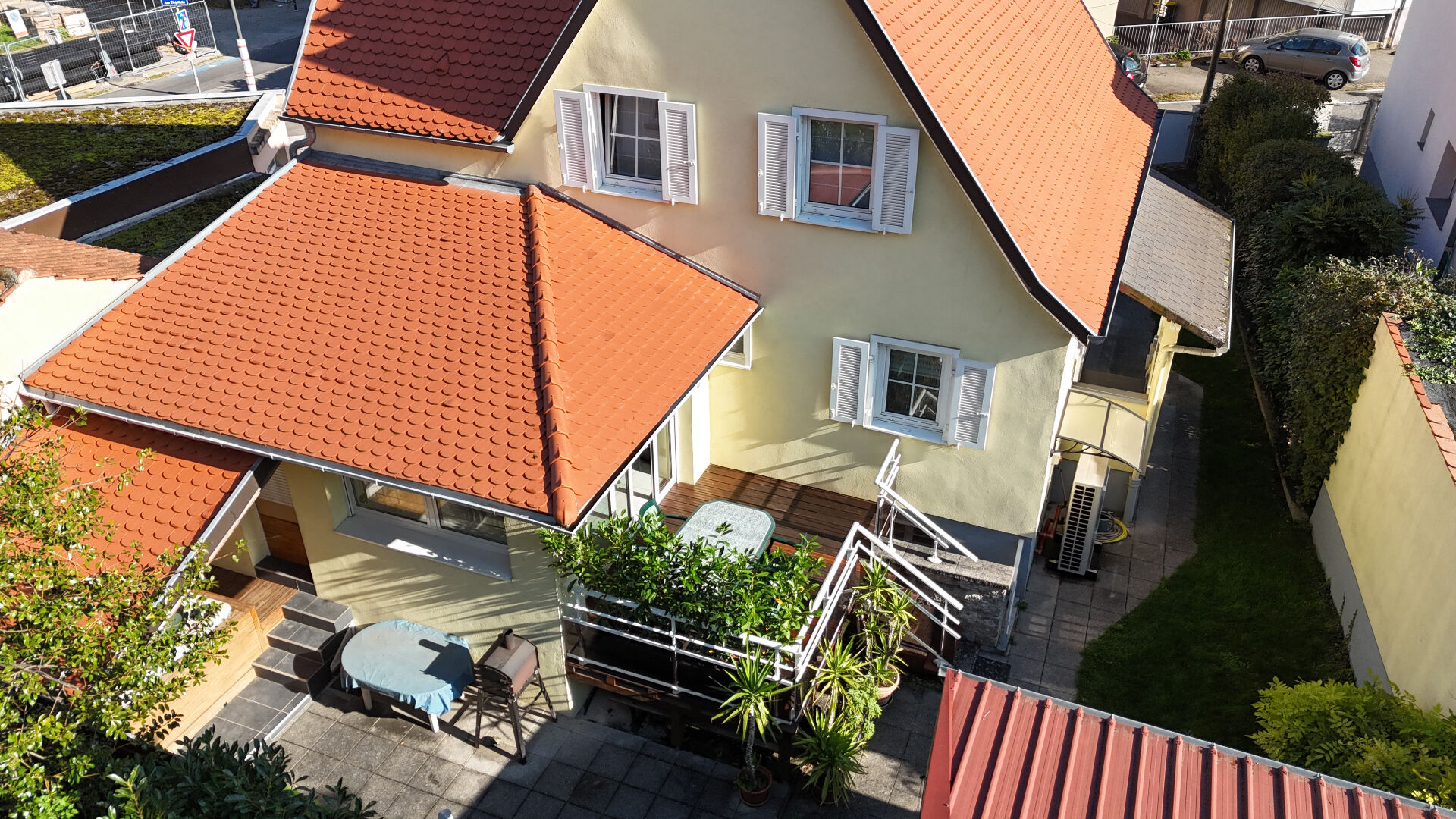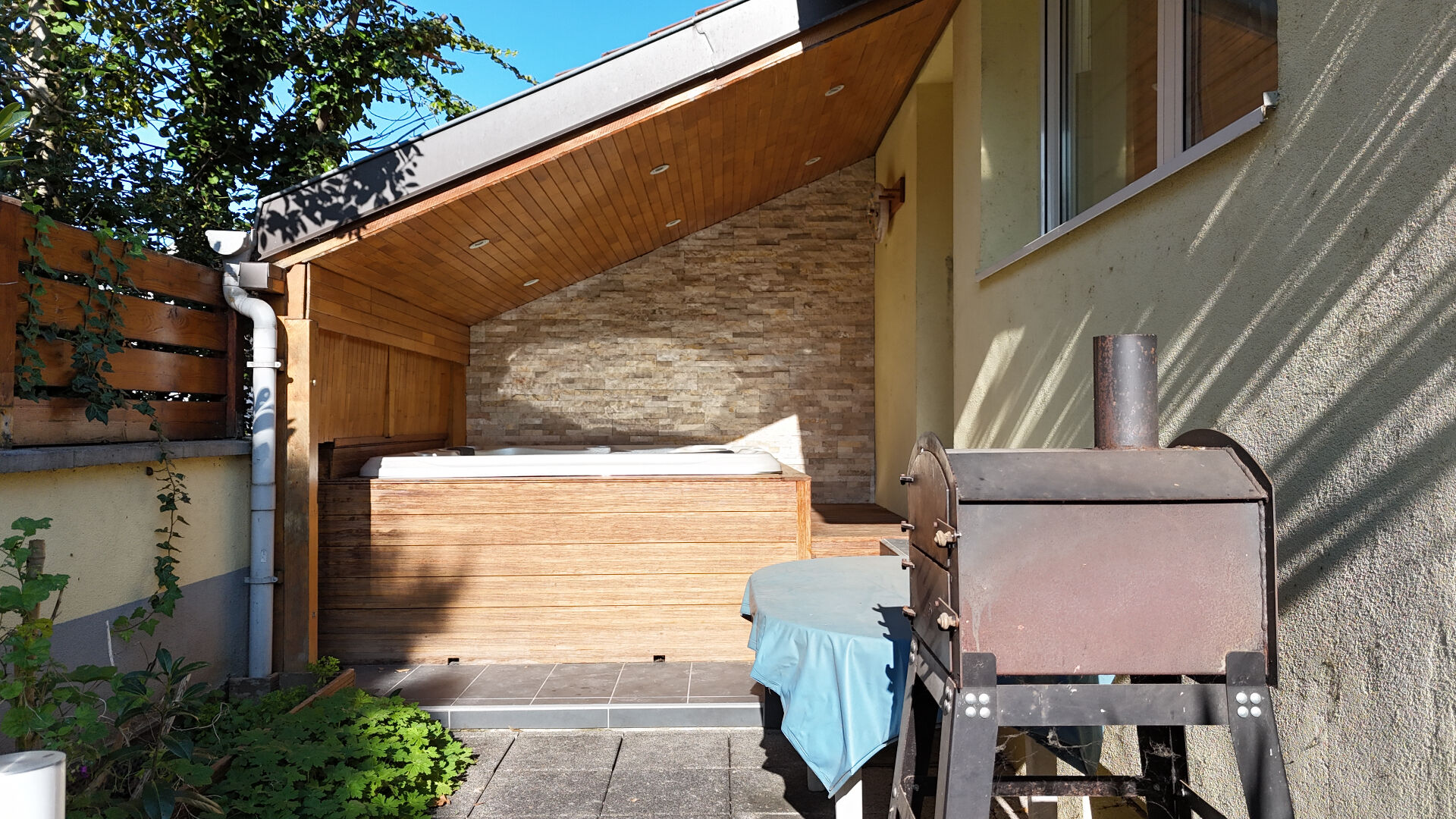 Les extérieurs s'organisent autour d'un espace jacuzzi couvert, complétés par un abri de jardin, un garage fermé et 2 places de stationnement.