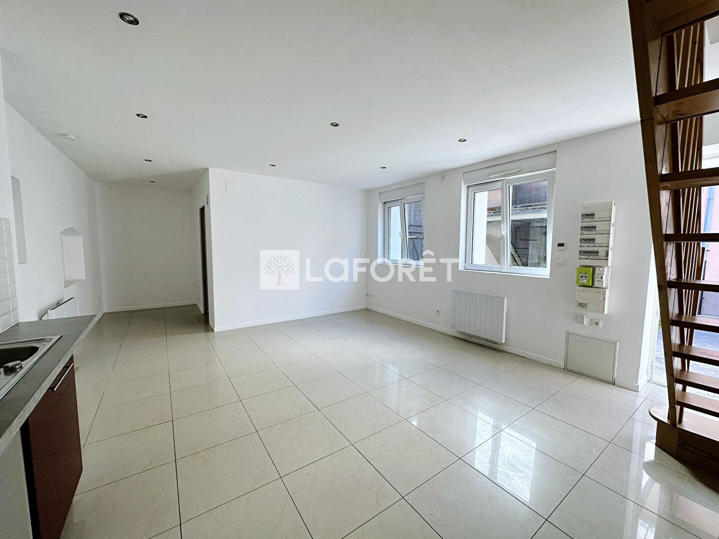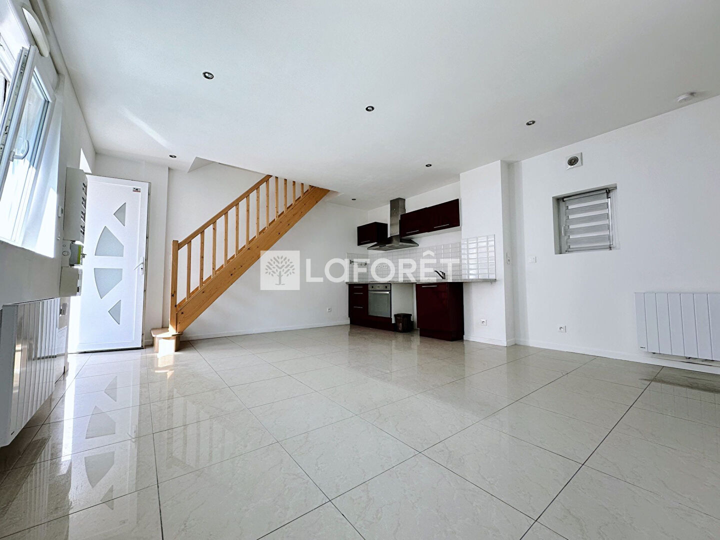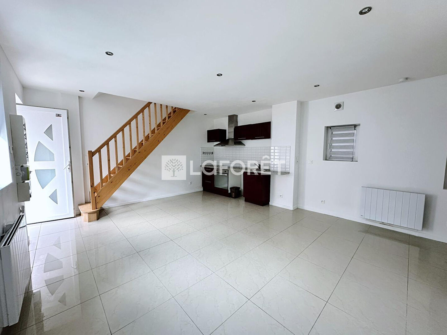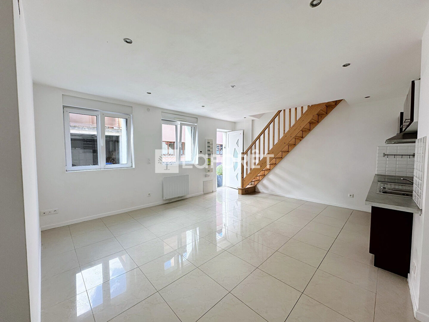 Au rez-de-chaussée, vous trouverez un salon-séjour lumineux avec cuisine aménagée et équipée, ainsi qu'une salle d'eau avec WC.