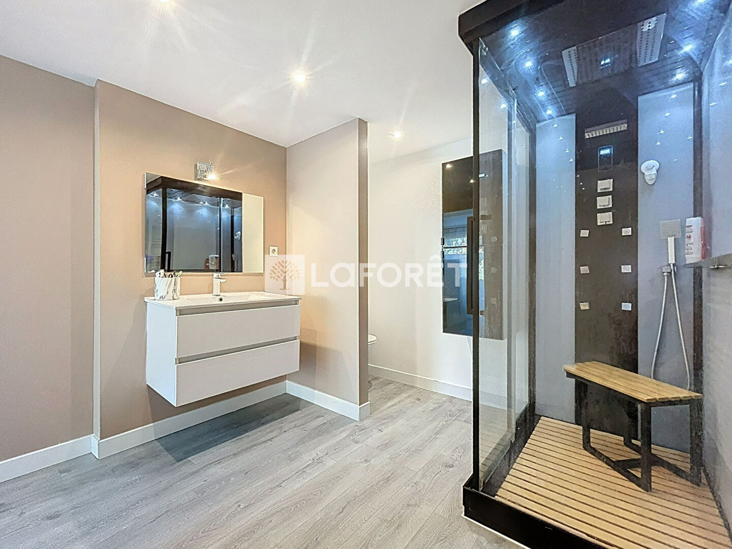 En rez-de-jardin, un véritable espace nuit indépendant vous attend : une chambre supplémentaire ou un bureau, une suite parentale avec dressing et salle d'eau équipée d'une cabine de douche balnéo pour un confort absolu. Vous y trouverez également une buanderie.