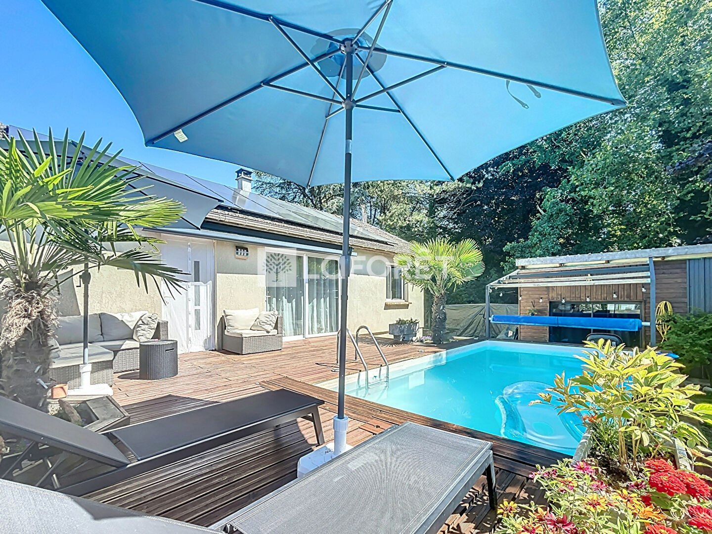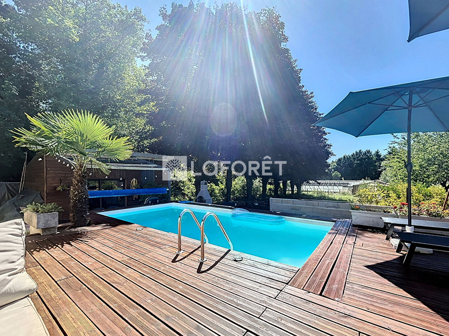 À l'extérieur, profitez d'une terrasse en bois pour vos moments de détente avec piscine, d'un jardin arboré ainsi qu'un abri de jardin pratique pour le rangement.