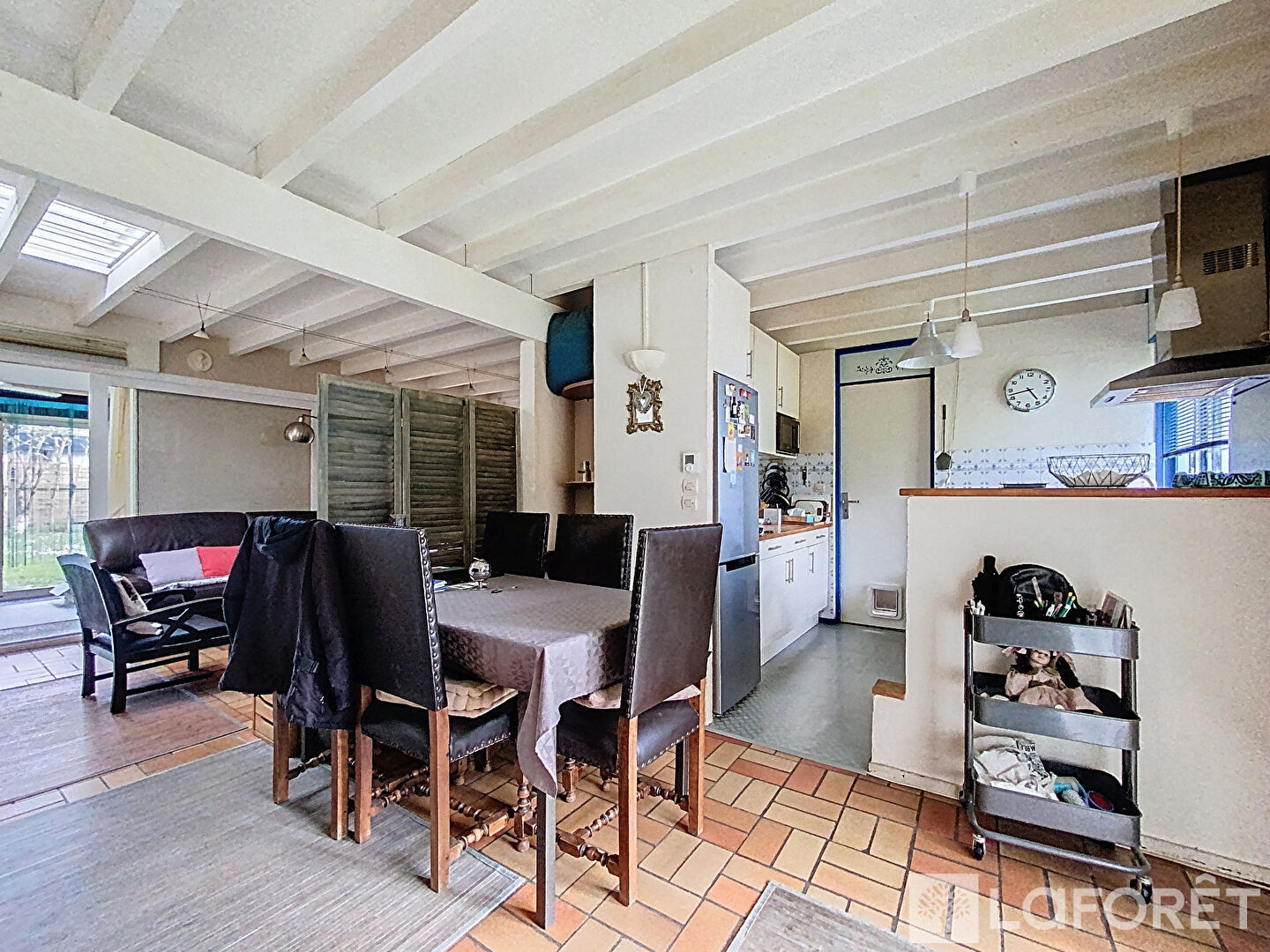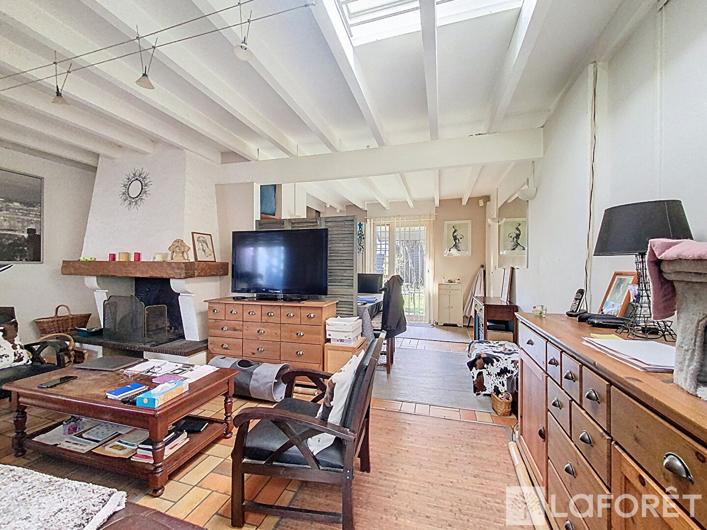 Elle se compose d'une entrée avec placard, une grande pièce à vivre avec cheminée, une cuisine ouverte et une véranda.