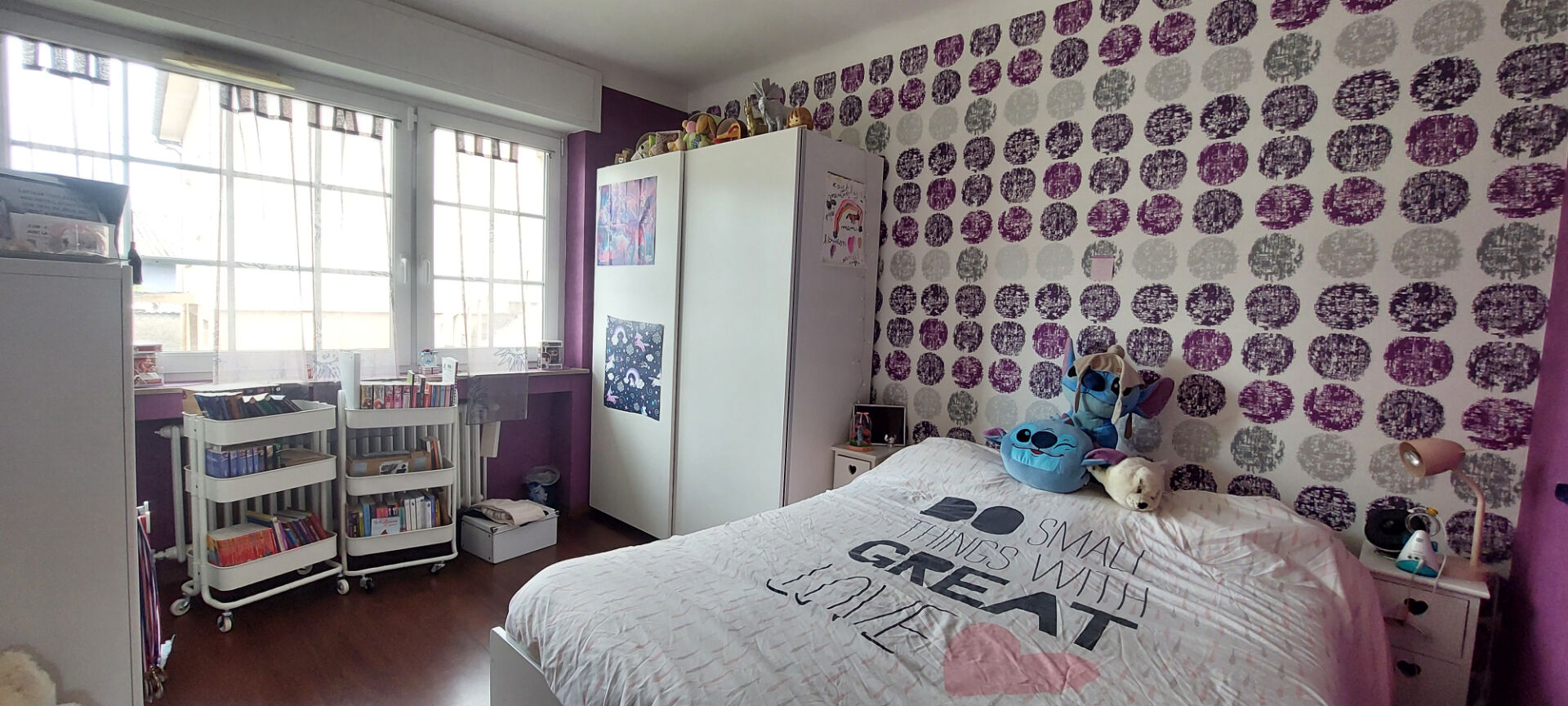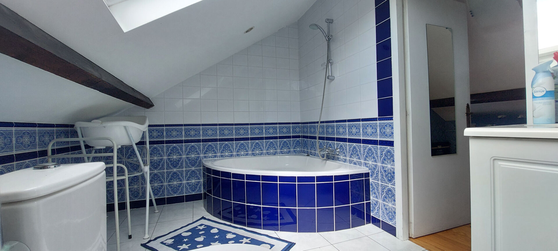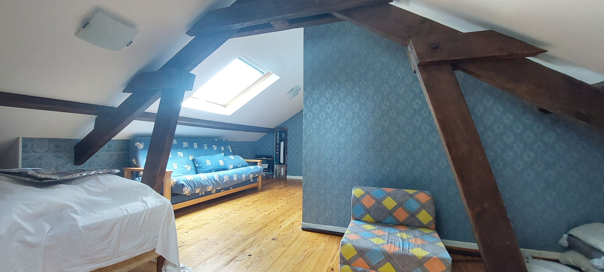 - Les combles sont aménagés pour offrir des espaces supplémentaires : un grand dégagement, une chambre avec salle de bains et WC, ainsi qu'une pièce pouvant servir de bureau ou de salle de jeux.