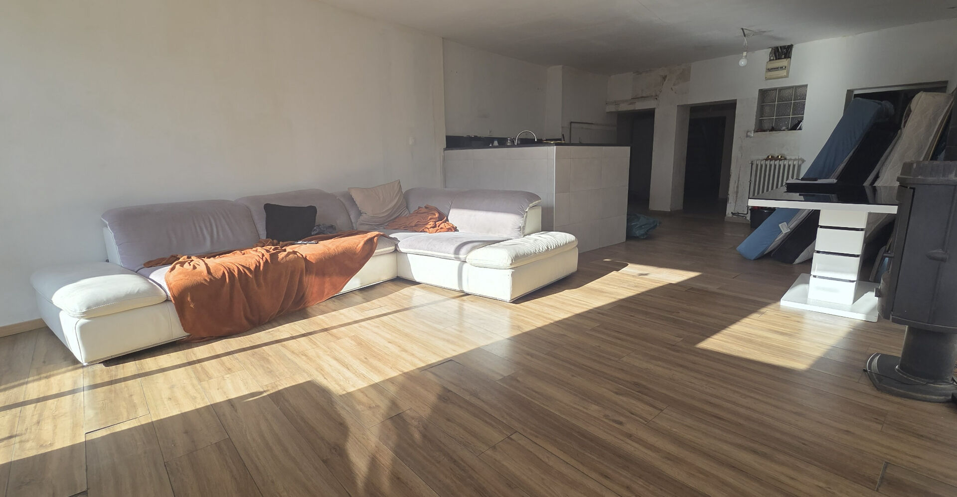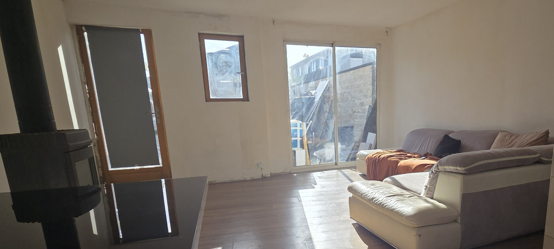 Actuellement, la maison se compose d'un hall d'entrée, d'un espace cuisine ouvert sur séjour de plus de 30 m² équipé d'un poêle à bois avec accès jardin. Une pièce de 13,80 m² et un espace salle de douche/wc de 6,50 m² est partiellement créer sur ce rez-de-chaussée.