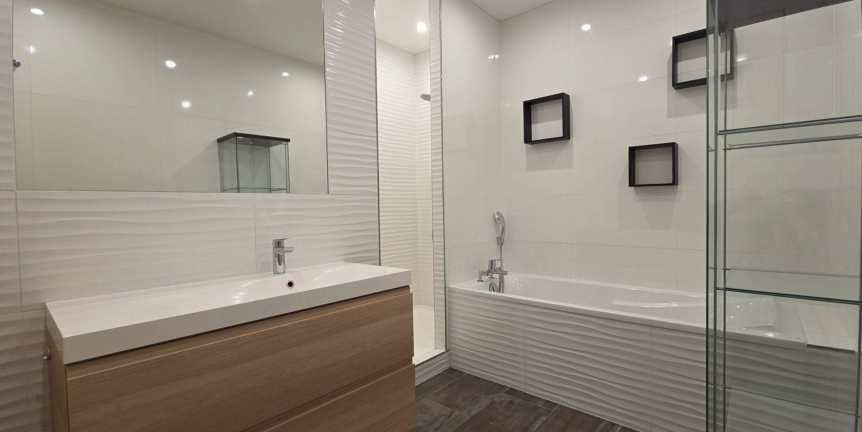 - Une salle de bain rénovée, équipée d'une douche et d'une baignoire,