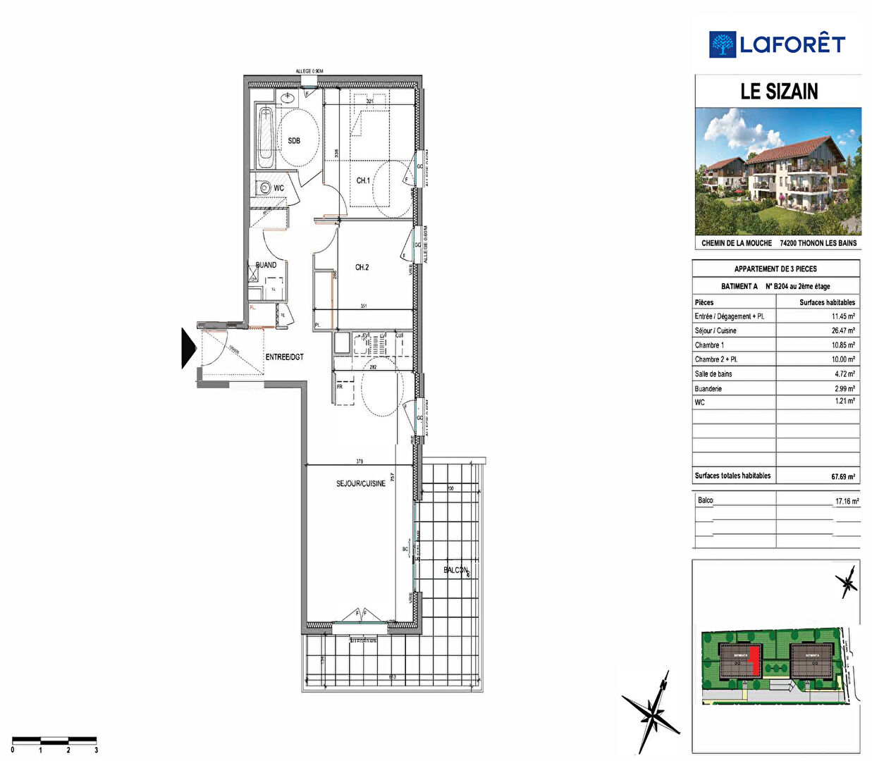 Appartement Type 3 de 67,69m² habitables situé au 2ème et DERNIER ETAGE avec ascenseur.