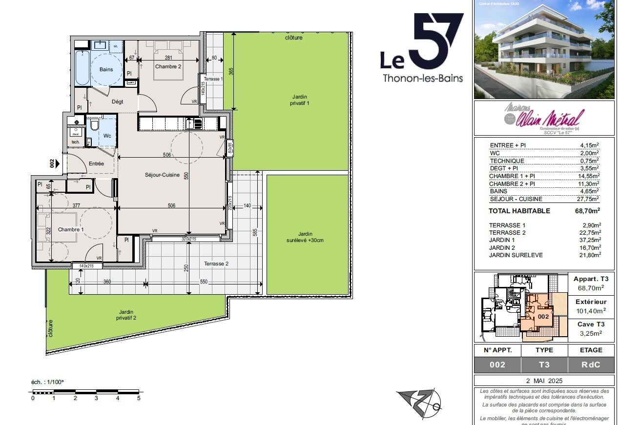 Un grand appartement Type 3 d'environ 68 m² avec deux Terrasses et jardin , Cave et Parking privatifs.