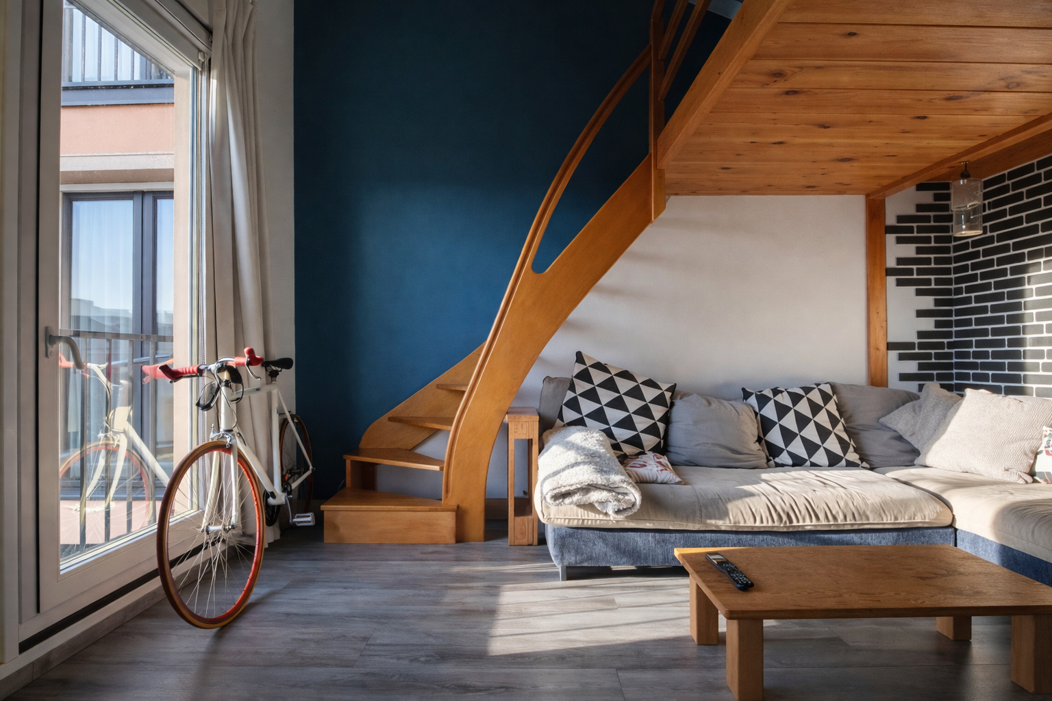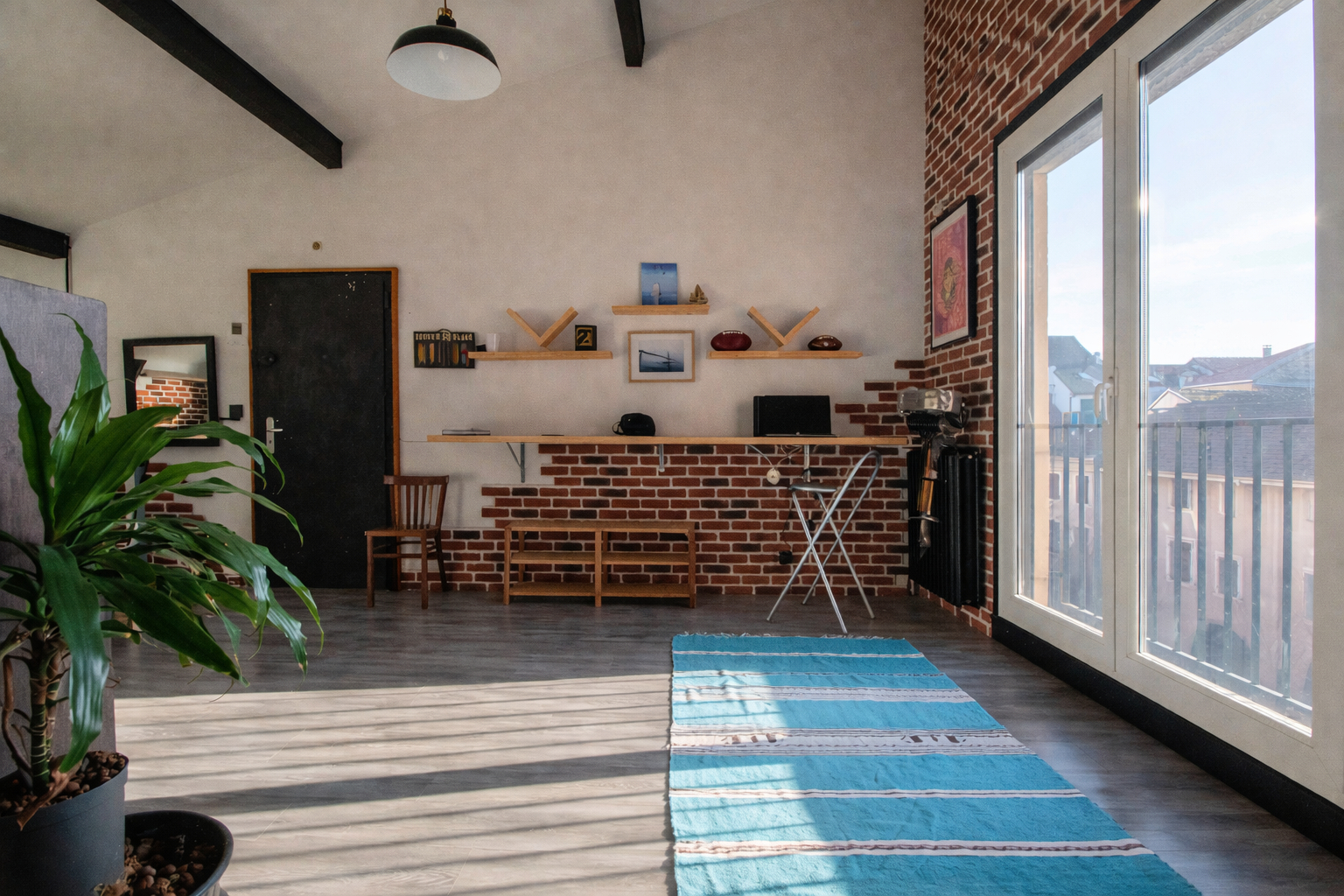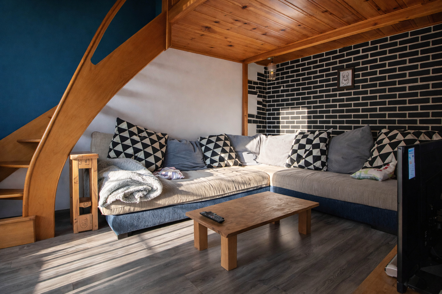 L'espace salon offre une atmosphère cocooning, baignée de lumière naturelle, avec une belle hauteur sous plafond typique des combles.
