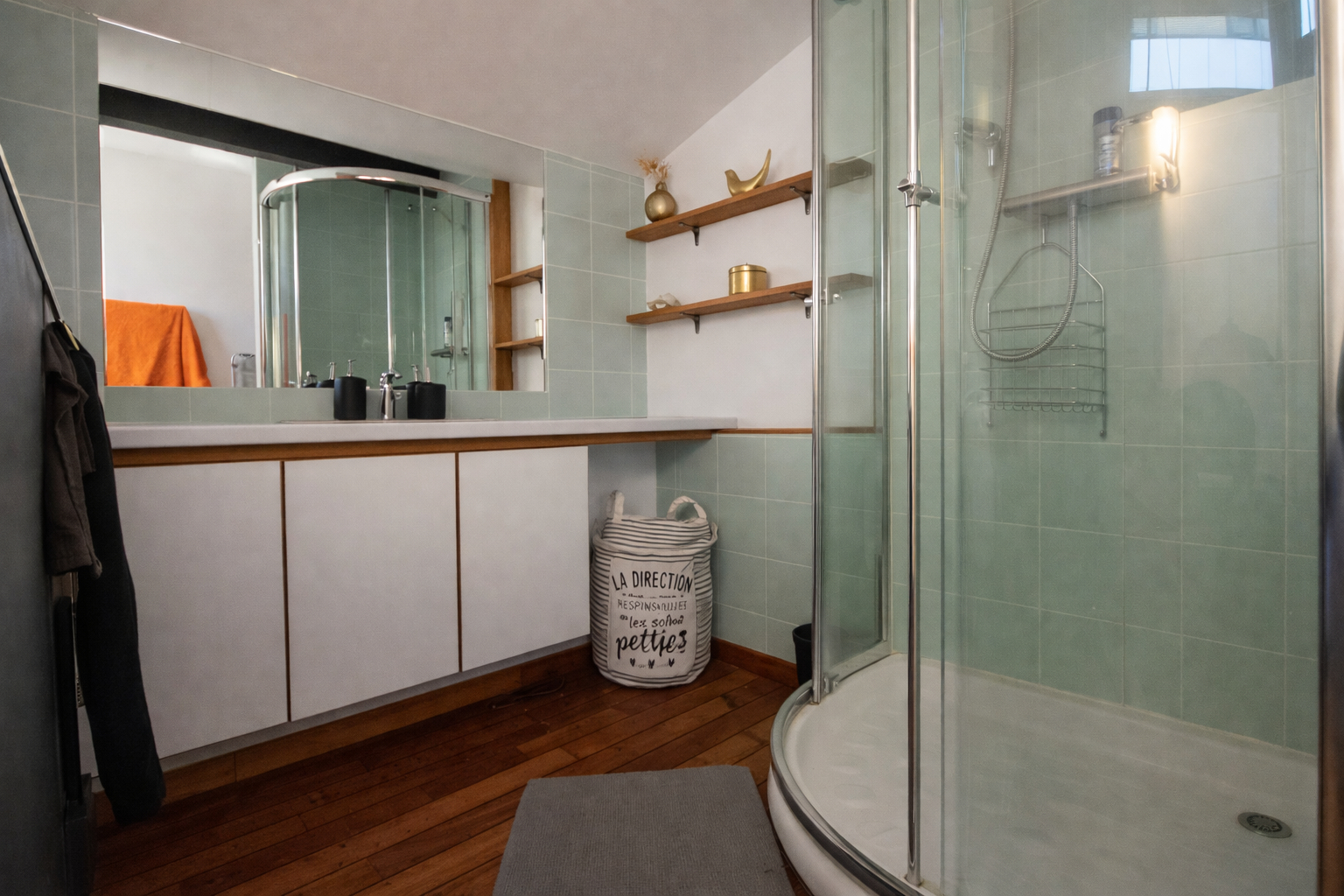 Salle d'eau fonctionnelle avec douche, pratique et bien agencée, nombreux rangements