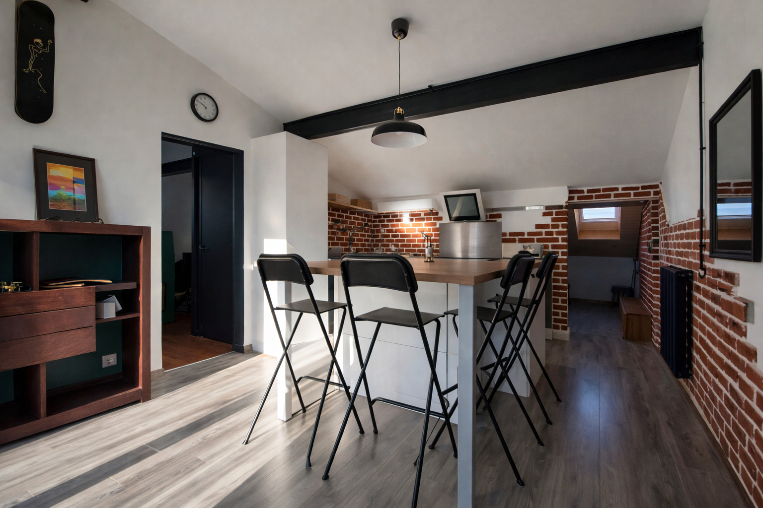 Dès l'entrée, vous découvrez une belle pièce de vie lumineuse avec cuisine ouverte et espace repas, sublimée par des matériaux de caractère (bois, briques, poutres apparentes). Un lieu convivial, idéal pour recevoir ou profiter du quotidien dans un cadre cosy.