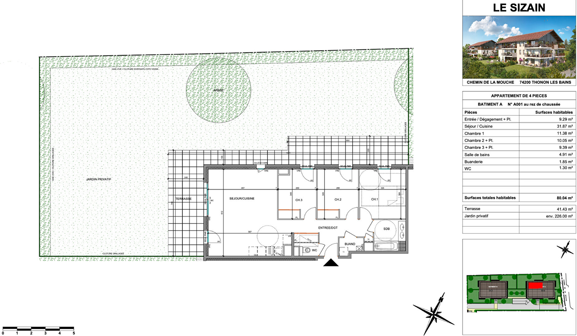 Appartement Type 4 de 80,04m² habitables avec JARDIN (226m²).