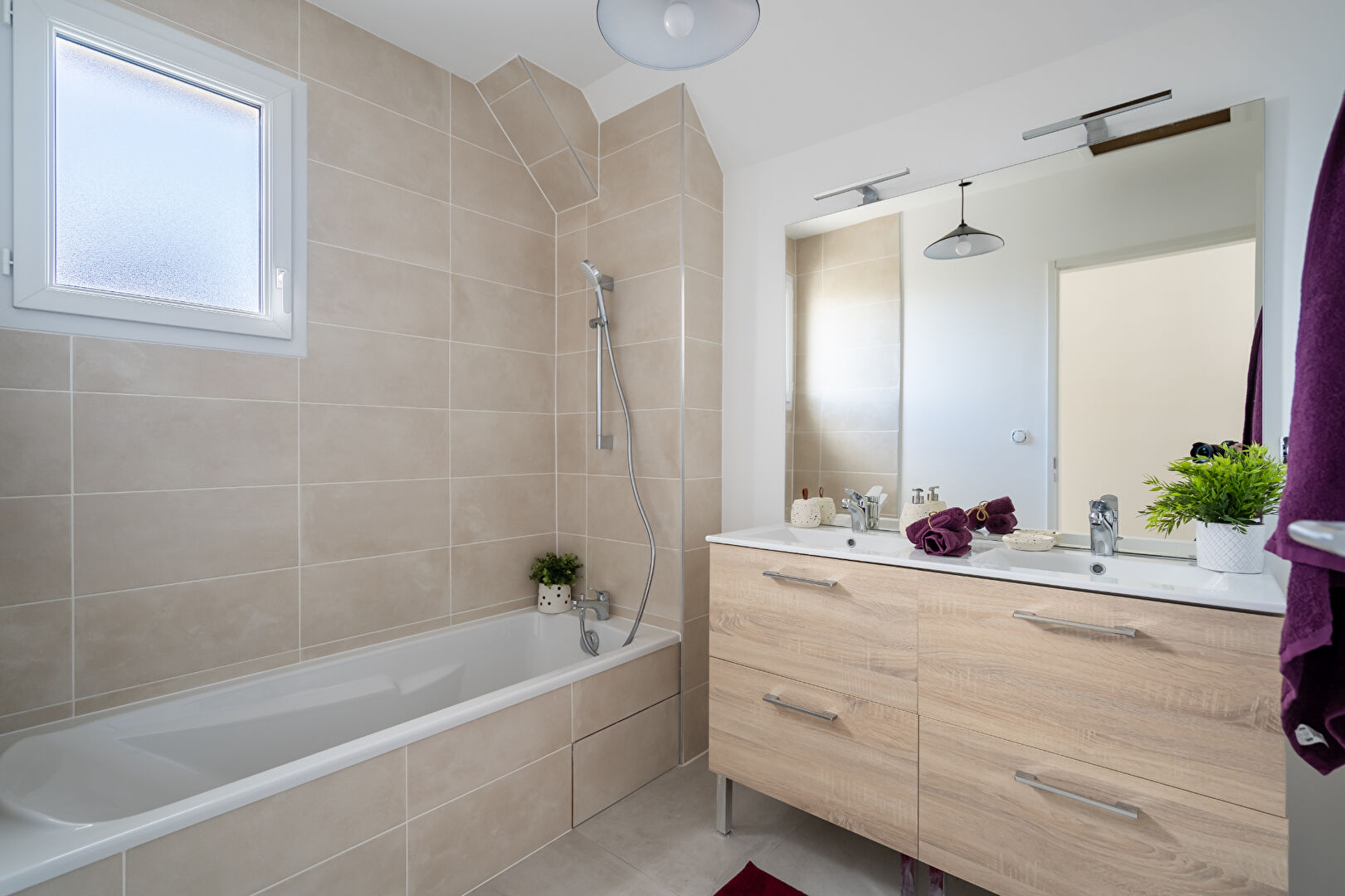 - Salles de bains équipées avec meuble vasque, miroir et applique lumineuse