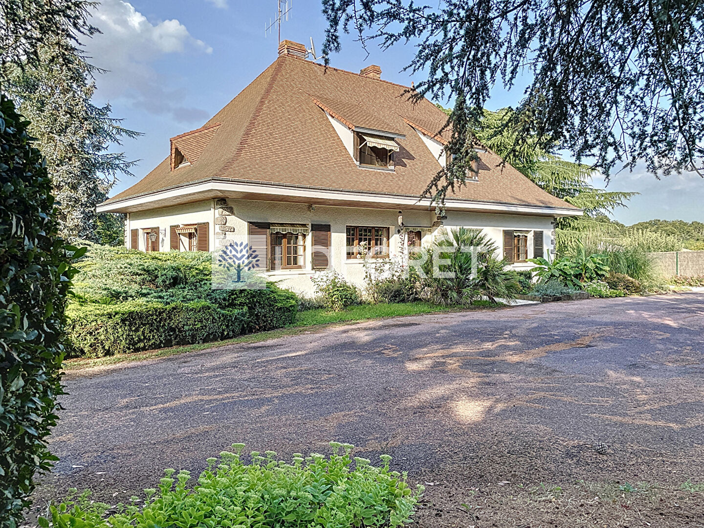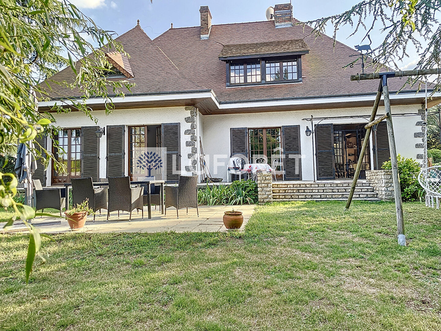 Propriété bâtie sur un terrain de 5240m2 clos et arboré. Lumineuse et spacieuse, elle offre au rez de chaussée :