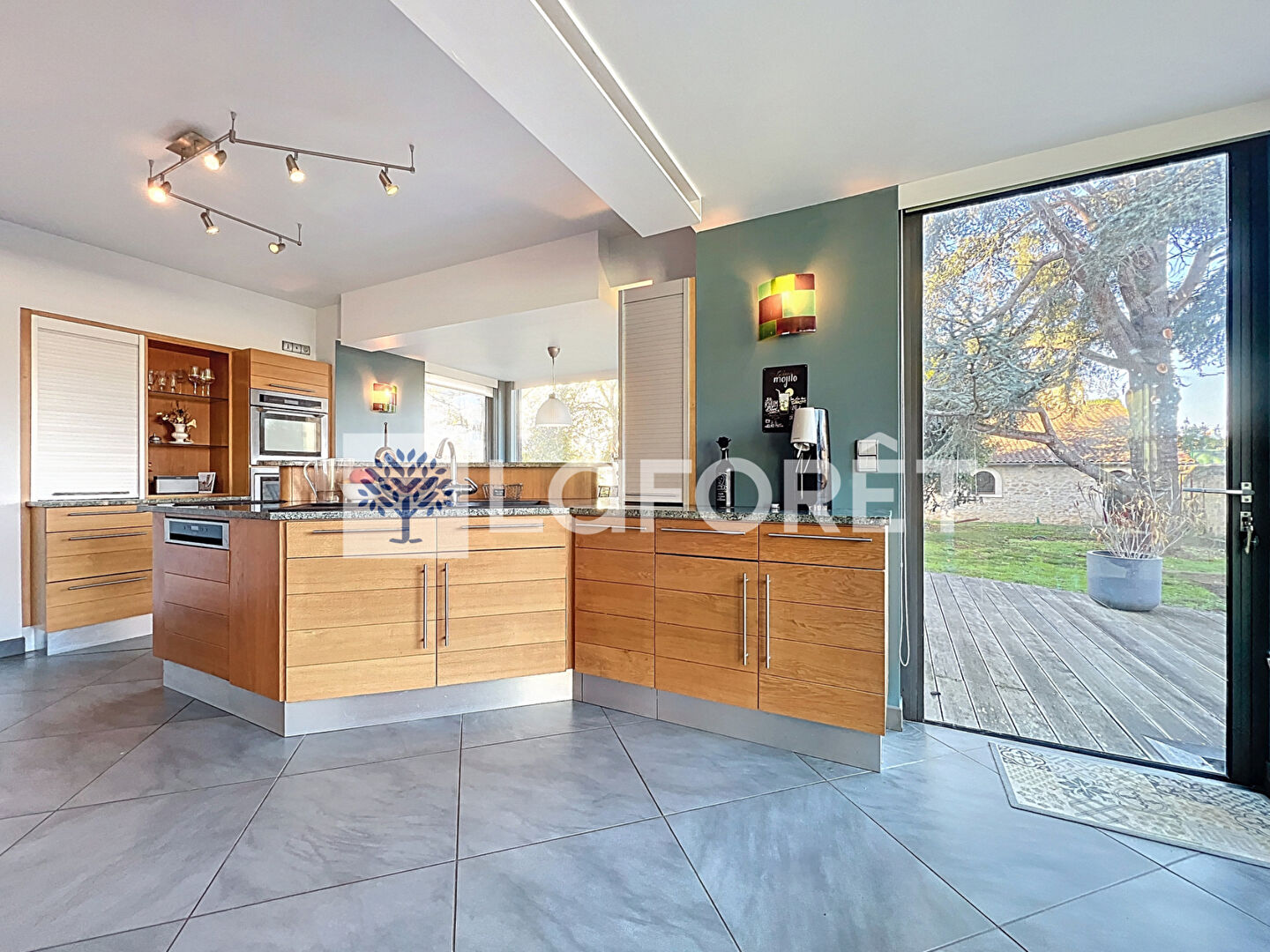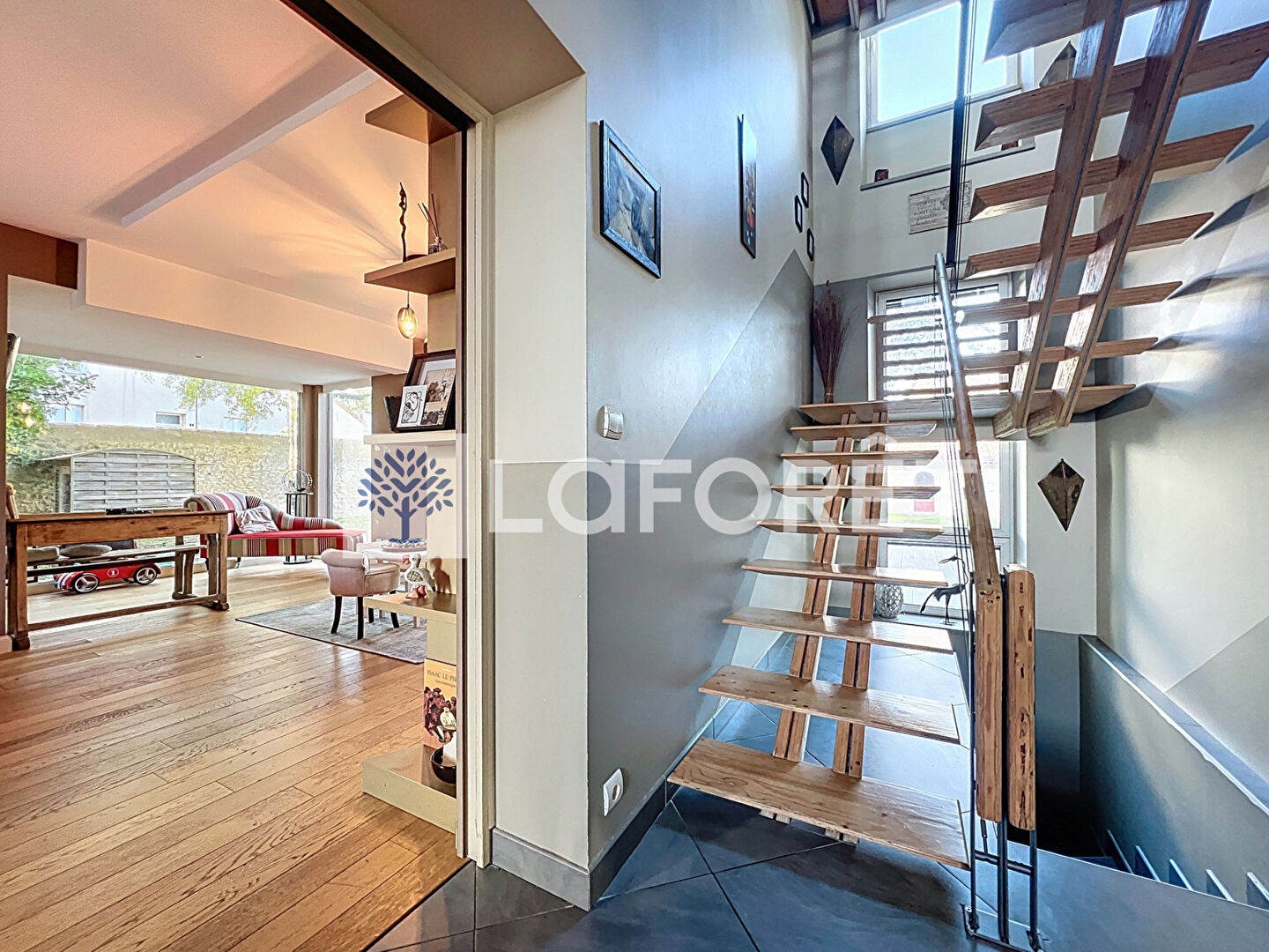 La pièce de vie est un véritable atout. La cuisine et le salon disposent de grandes baies vitrées ouvrant directement sur l'extérieur, apportant modernité, confort et une luminosité exceptionnelle. Cet espace constitue le coeur de la maison et est mis en valeur par un escalier ouvert qui renforce la sensation de volume et de circulation fluide entre les niveaux.