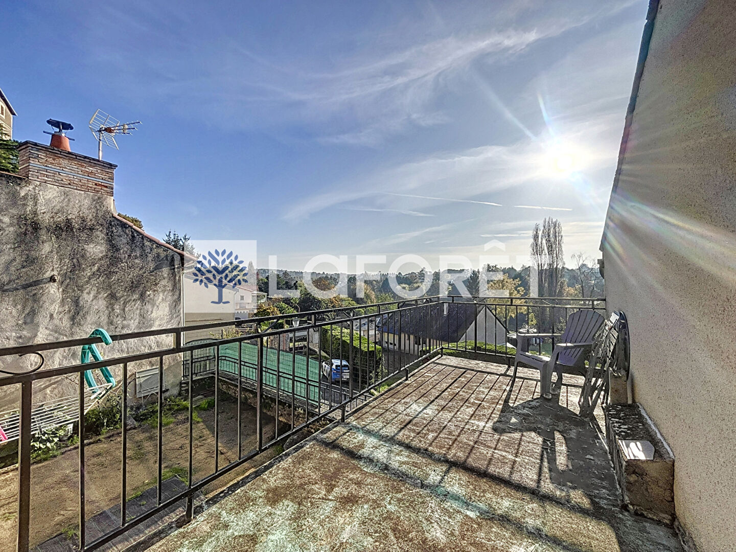 À l'étage supérieur, un palier mène à trois chambres, dont une avec salle de bains, WC et accès direct à un balcon offrant une vue dégagée.