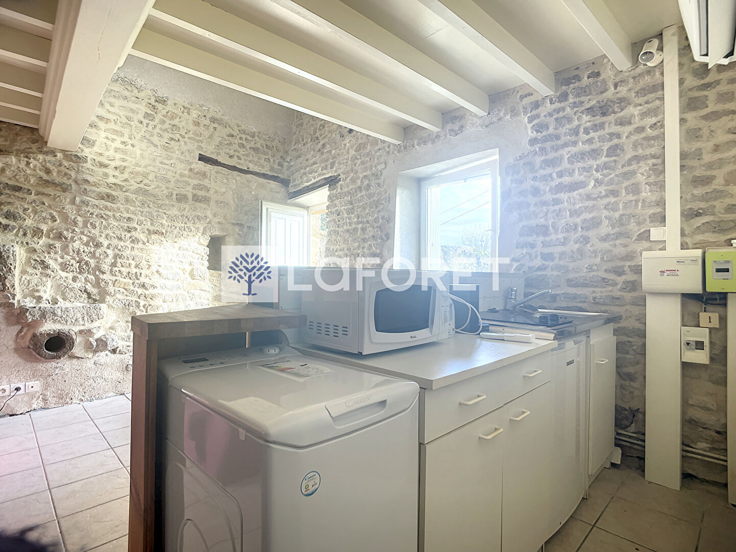 micro-onde, machine à laver et placards de rangement, vaisselles, nécessaires de ménages), pièce de vie avec canapé, table de repas avec tabourets.