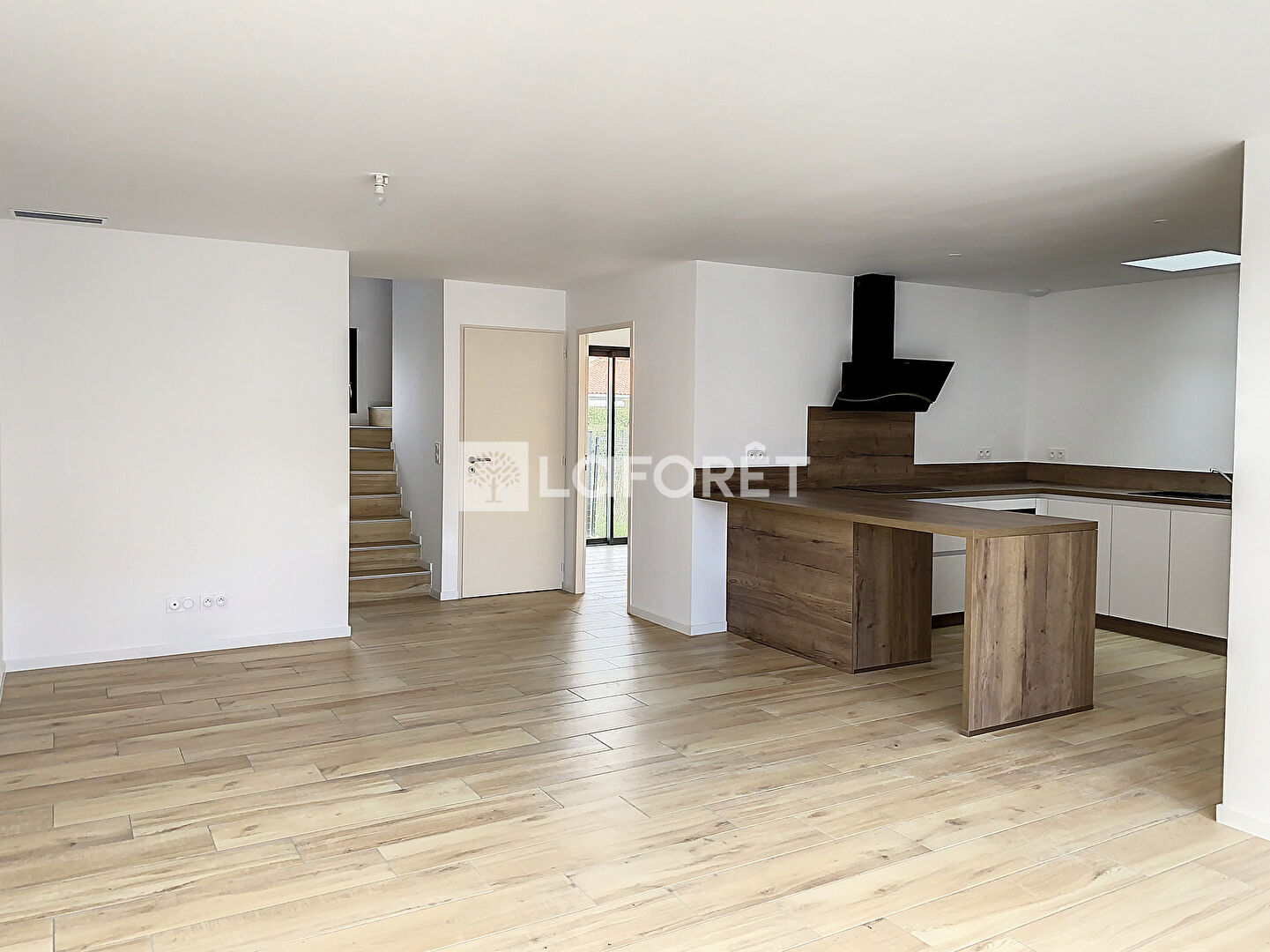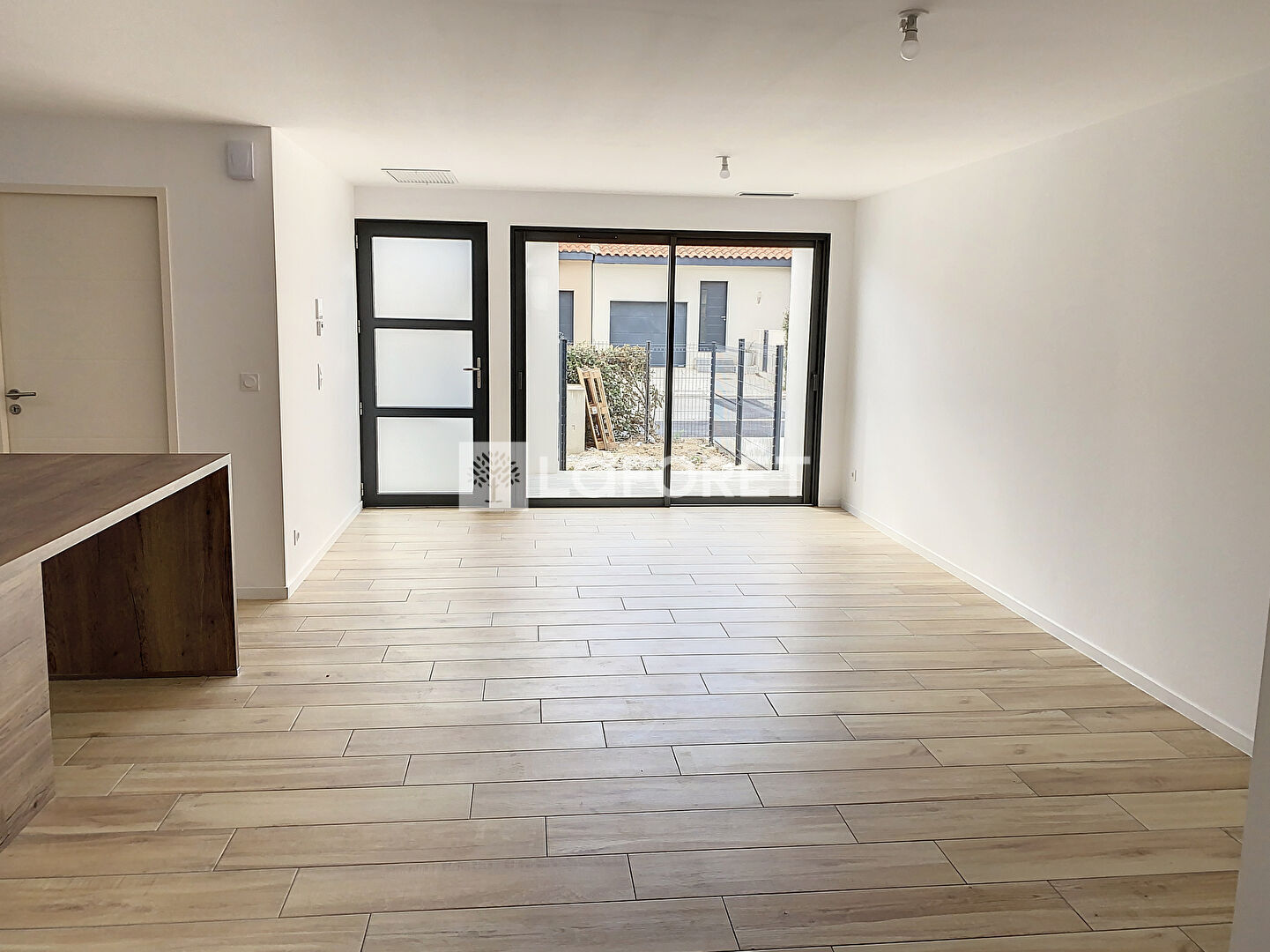 Elle se compose en rez-de-chaussée d'une pièce de vie avec cuisine aménagée et équipée très lumineuse, 1 chambre, une salle d'eau avec wc et 1 garage.