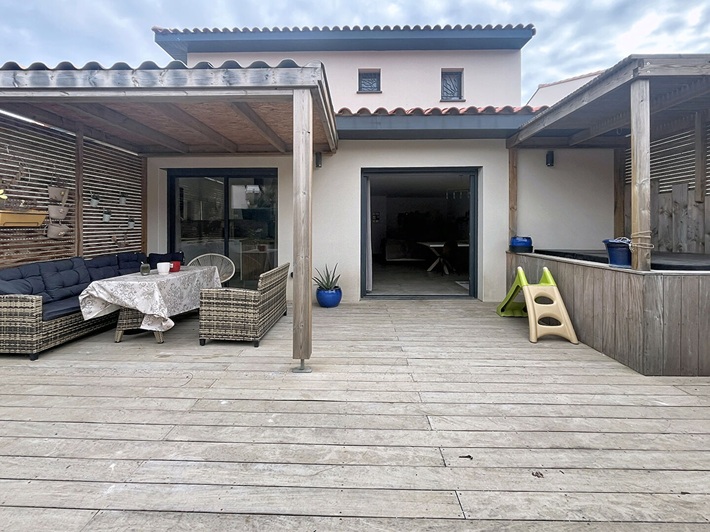 Côté pratique, la maison dispose d'un garage avec mezzanine, offrant un bel espace de rangement ou un potentiel d'aménagement supplémentaire. À l'extérieur, profitez d'un jacuzzi quatre places et d'un espace déjà prévu pour accueillir une future cuisine d'été, parfait pour vos moments de détente et de réception.