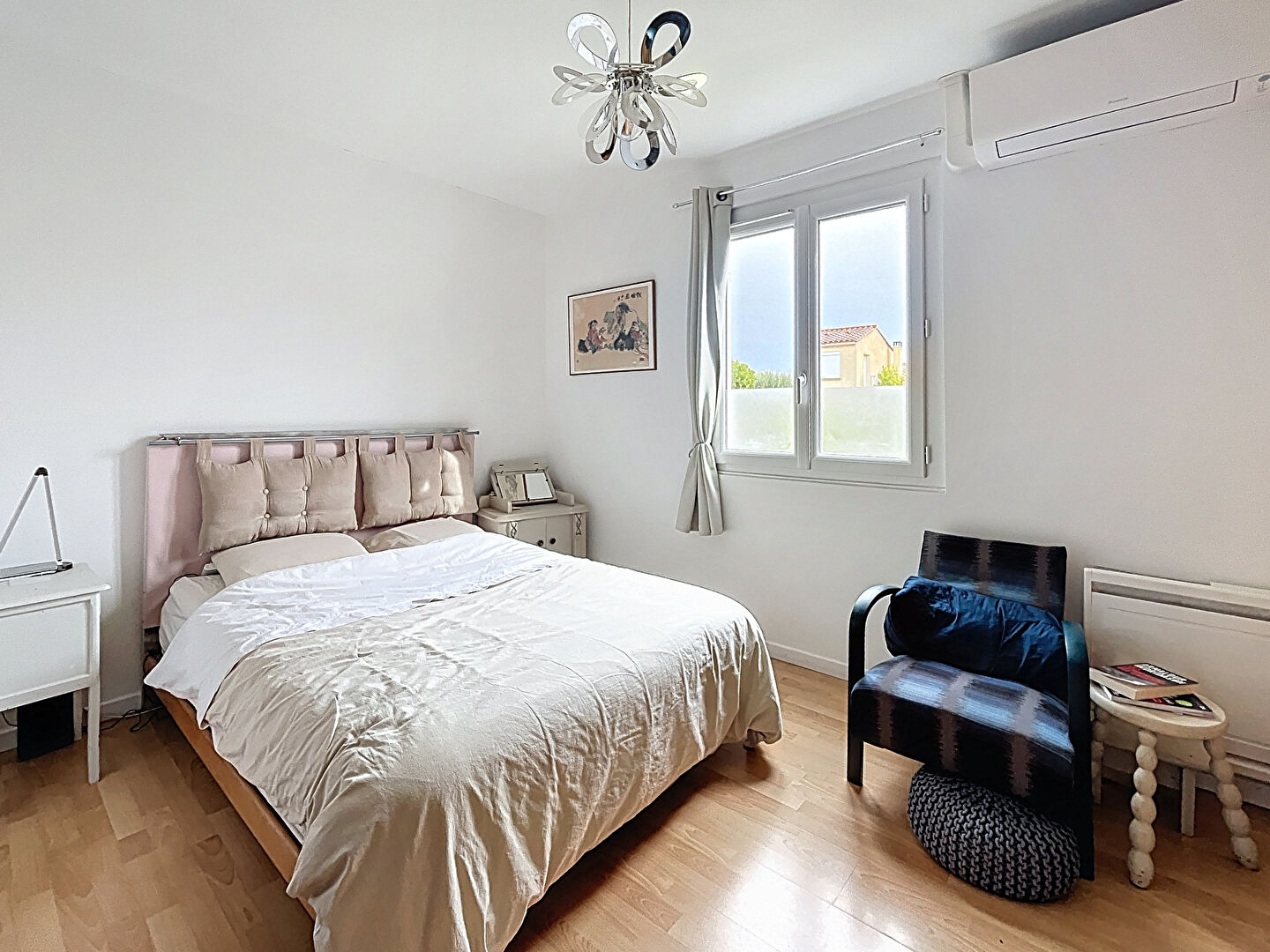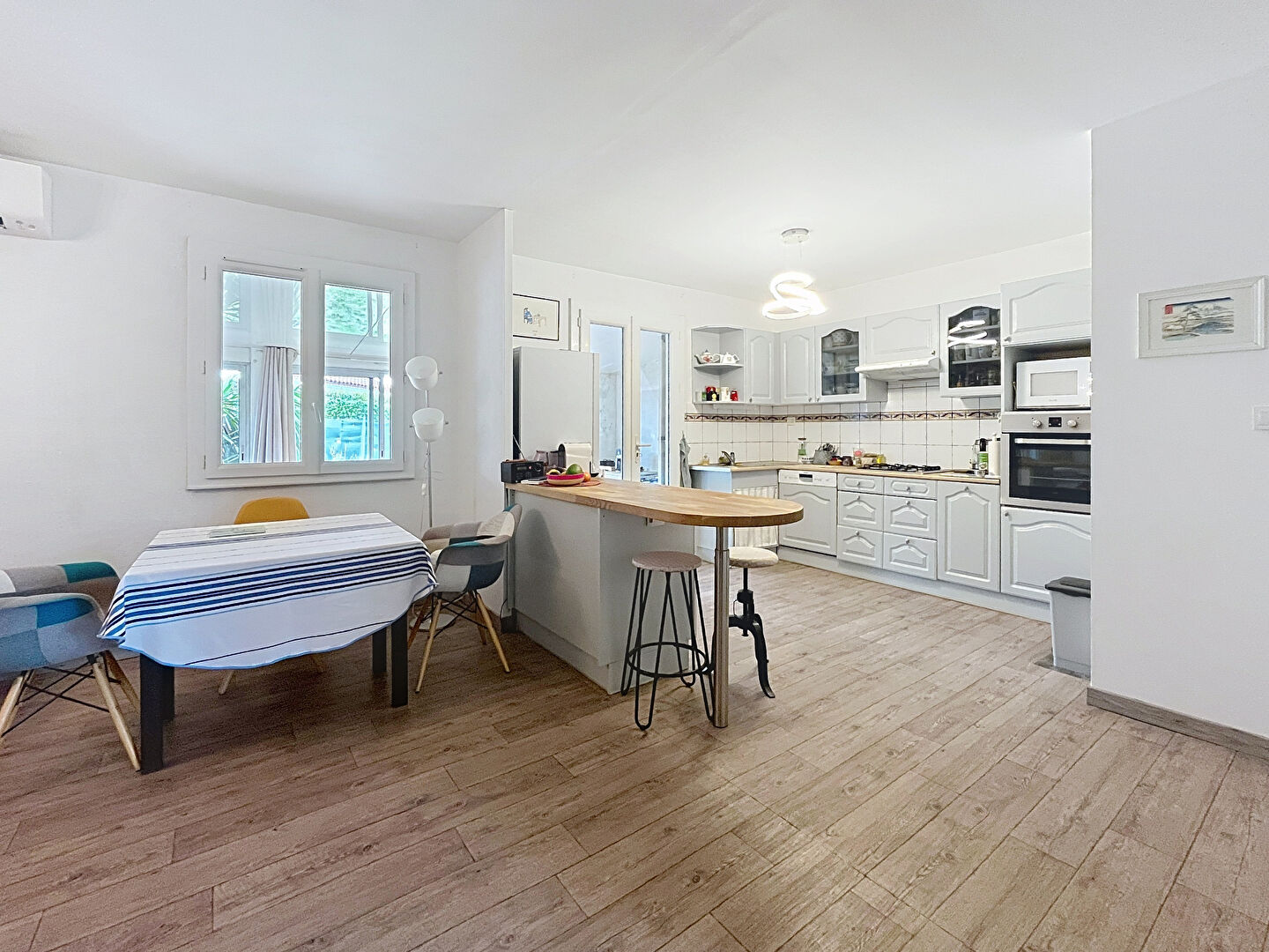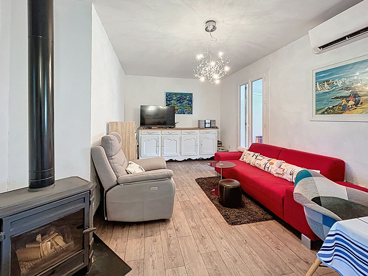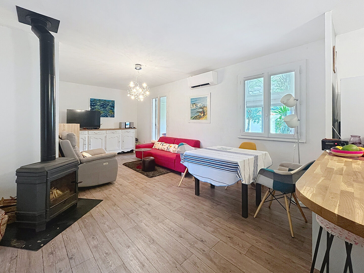 Le confort est assuré toute l'année grâce à une climatisation réversible complétée par un poêle à bois, parfait pour une ambiance chaleureuse en hiver.
