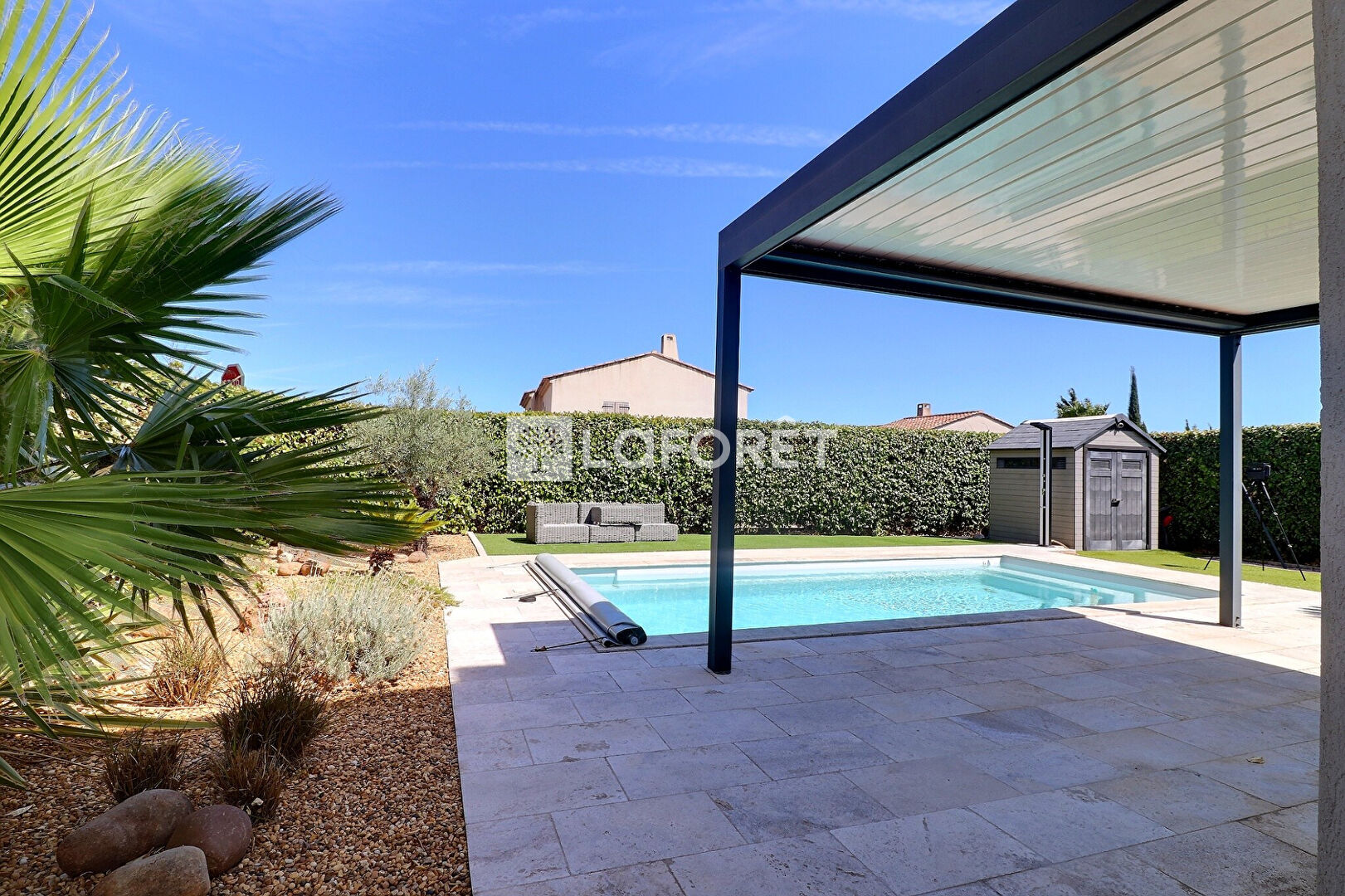 À l'extérieur, vous serez séduit par la piscine exposée plein sud, idéale pour les moments de détente. Une pergola bioclimatique vous permettra de profiter des repas en extérieur à l'ombre. Un garage avec mezzanine et plusieurs places de stationnement privatives ajoutent un confort indéniable à cette maison.