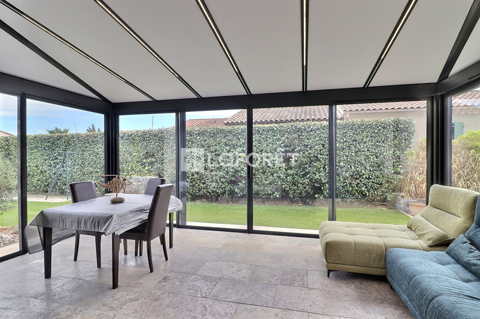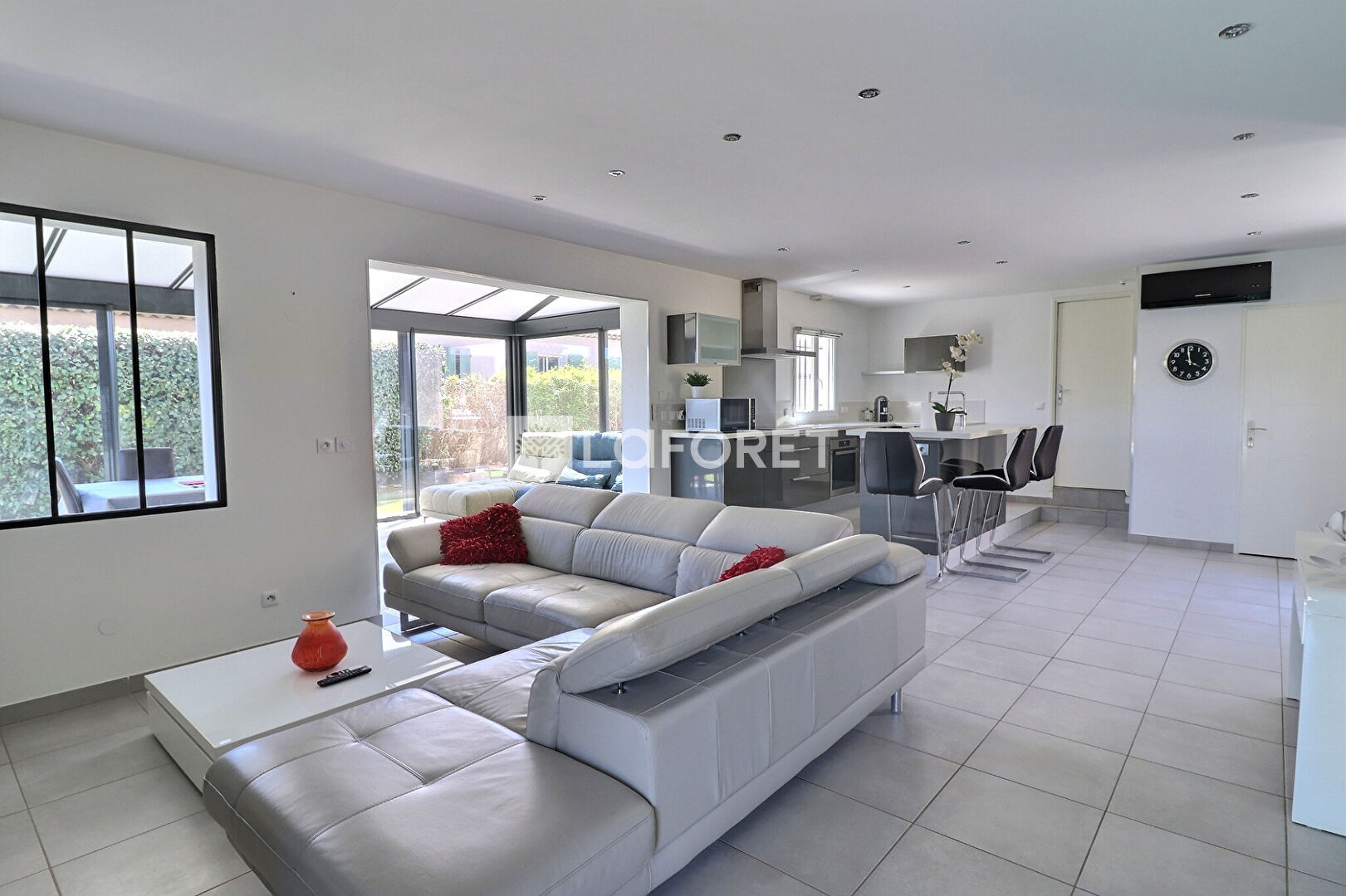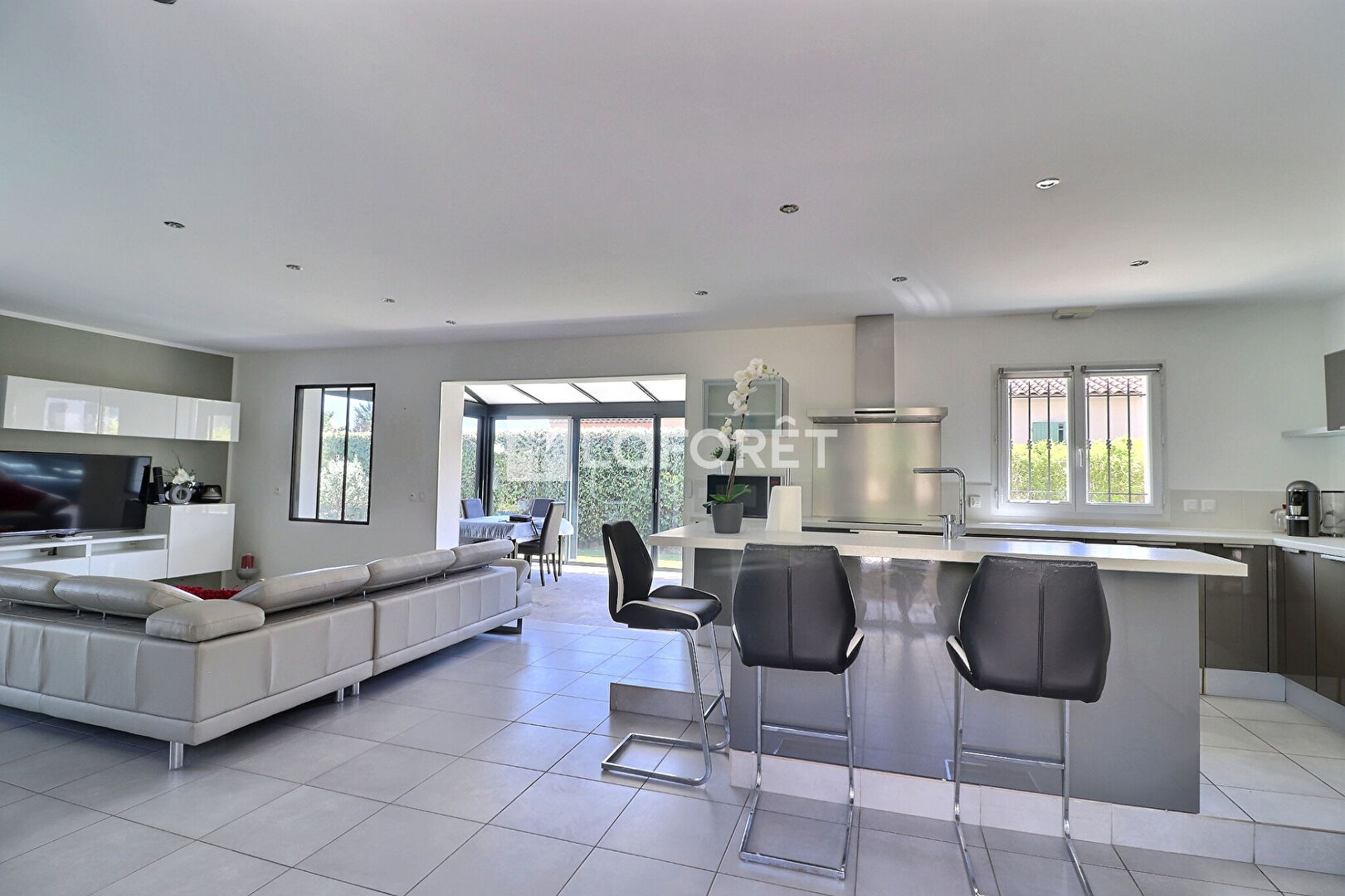 Au rez-de-chaussée, vous découvrirez une belle pièce de vie lumineuse d'environ 66 m², comprenant une cuisine ouverte avec îlot central et un coin salon, le tout prolongé par une véranda climatisée offrant un agréable espace supplémentaire.