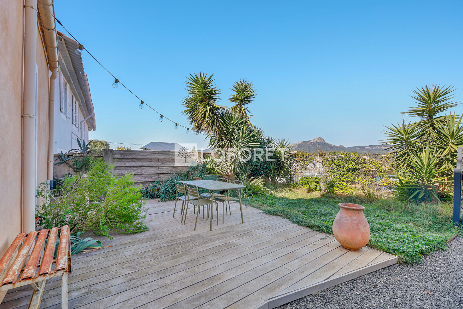 La maison bénéficie de deux extérieurs : une terrasse intimiste végétalisée et un jardin orienté vers les collines avec une vue dégagée.