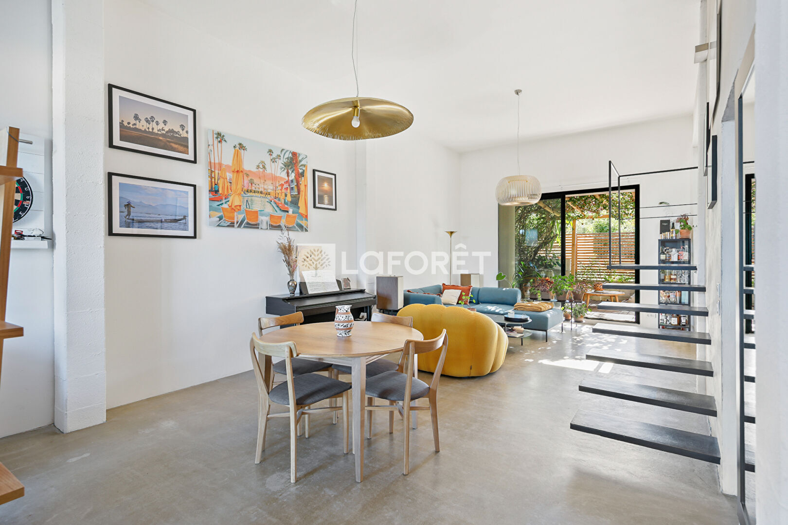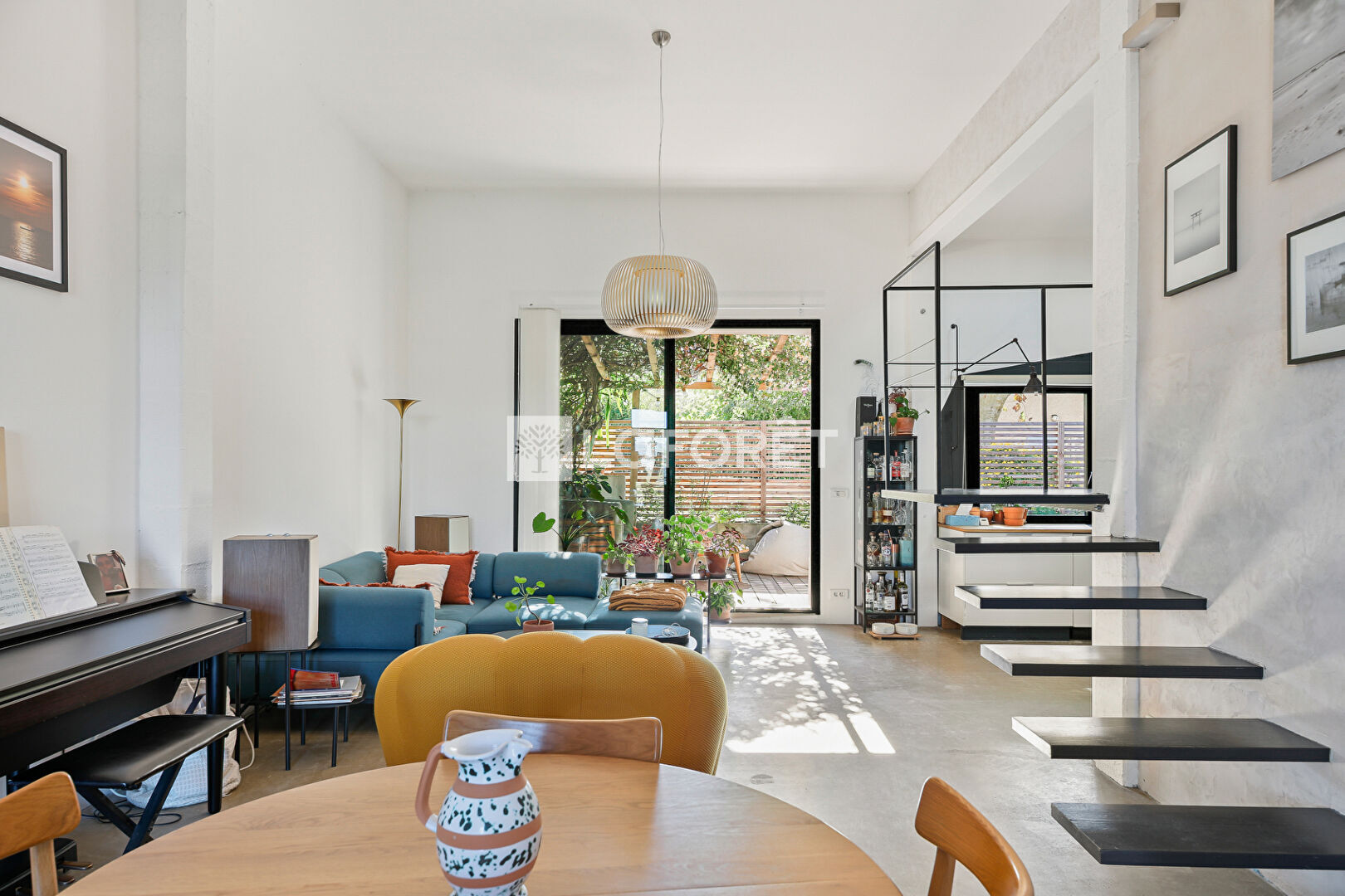 Elle offre une vaste pièce de vie de 59 m² avec une belle hauteur sous plafond de 3,50 m. Ce grand espace regroupe un salon, une salle à manger et une cuisine ouverte moderne, avec un accès direct vers l'extérieur.