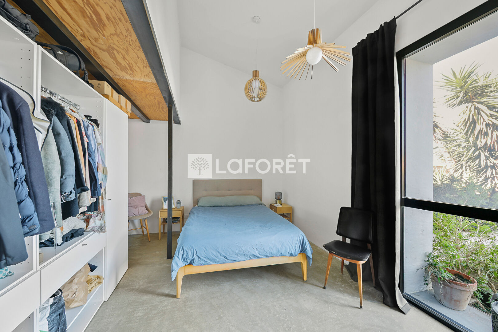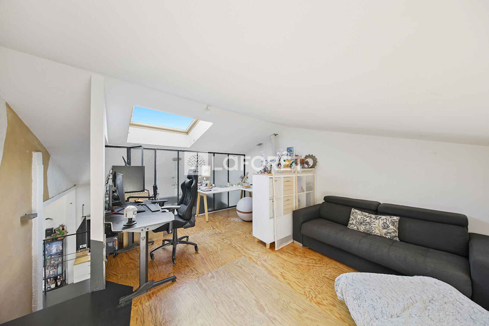 À l'étage, une mezzanine surplombant le séjour permet d'aménager un coin bureau ou une seconde chambre selon les besoins.