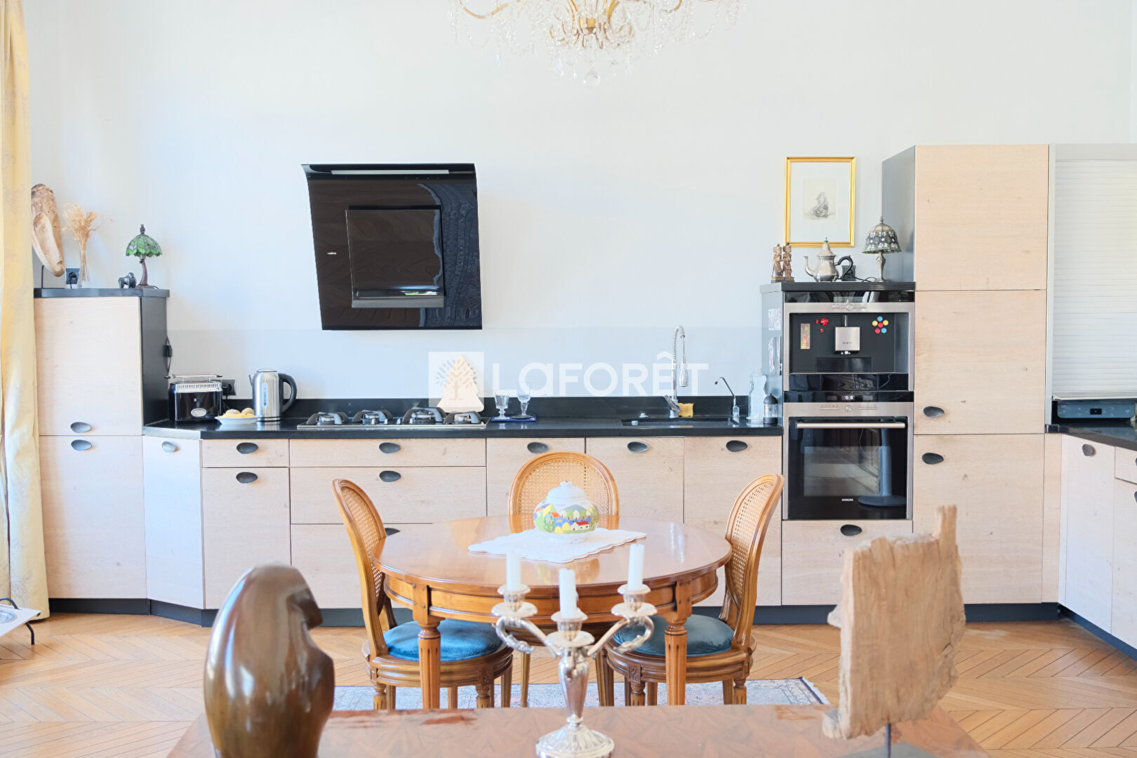 Le séjour double baigné de lumière naturelle invite à la convivialité et à la contemplation. Il se prolonge vers une cuisine sur mesure élégamment intégrée, équipée d'un électroménager haut de gamme (Siemens, Bosch, Elica, Baumatic). Une salle à manger centrale et des éléments de décoration raffinés confèrent à l'ensemble une atmosphère à la fois chic et chaleureuse.