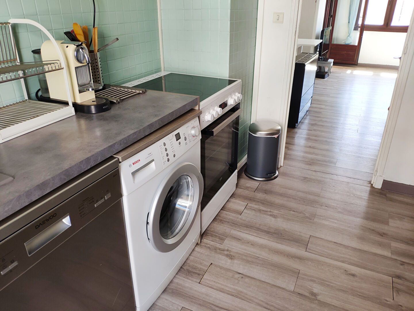 * Cuisine semi ouverte, entièrement équipée (grand réfrigérateur combiné, cuisinière vitrocéramique, micro ondes, lave vaisselle et lave linge hublot, vaisselle et ustensiles, cafetière Nespresso, grille pain, bouilloire). Balcon dans la cuisine avec gazon synthétique, table et chaises de jardin.