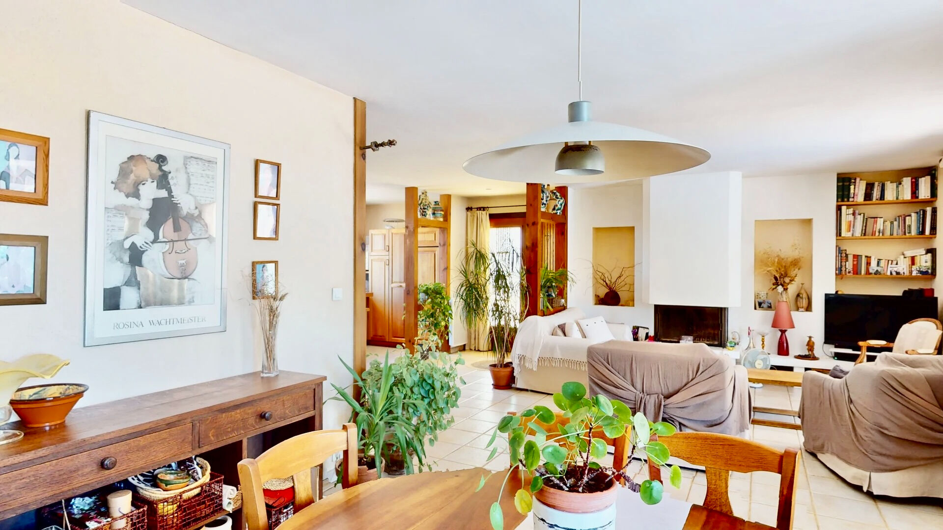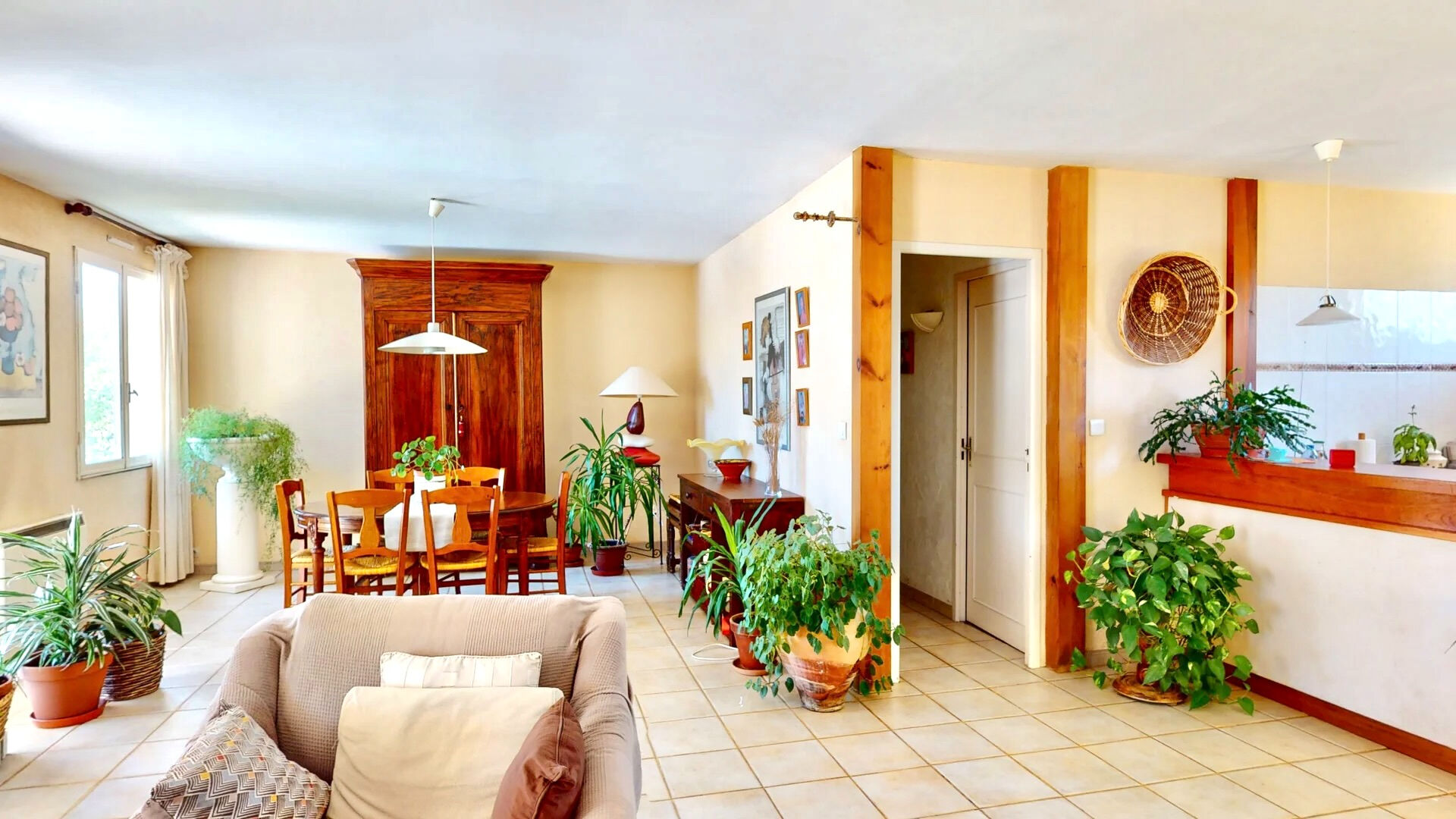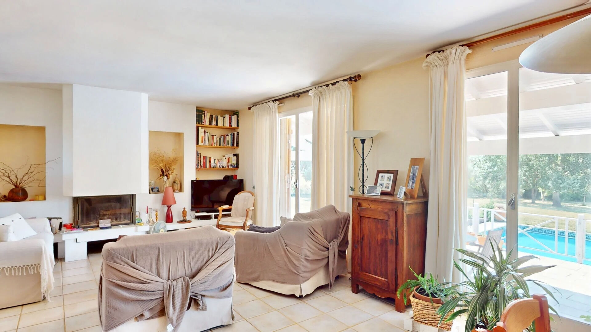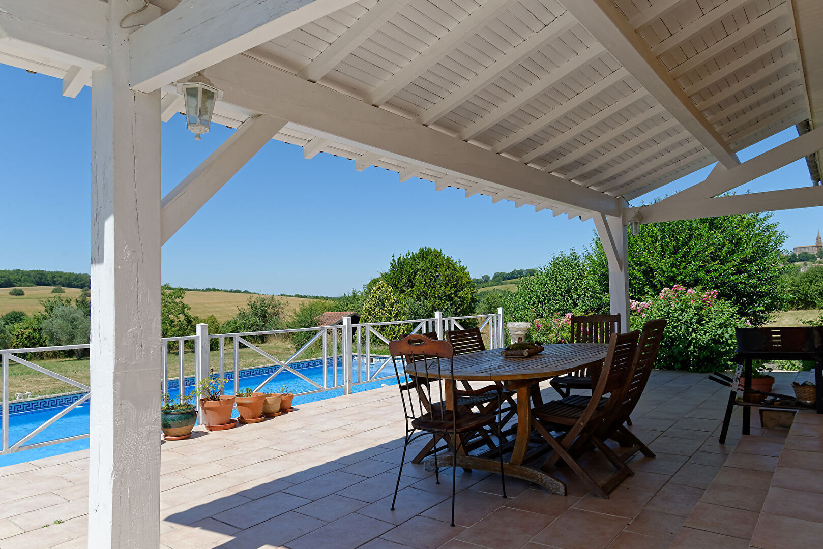 Cet espace de vie donne directement accès à une grande terrasse et à la piscine creusée 12x6 au chlore, le tout offrant une vue dégagée et imprenable sur la campagne environnante.