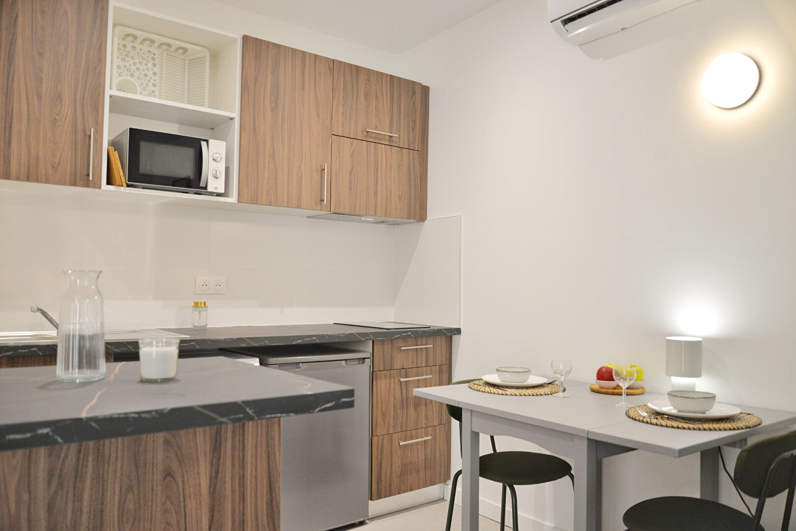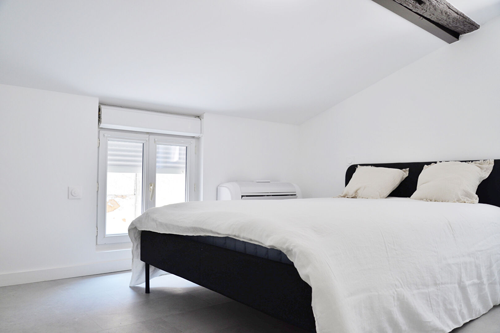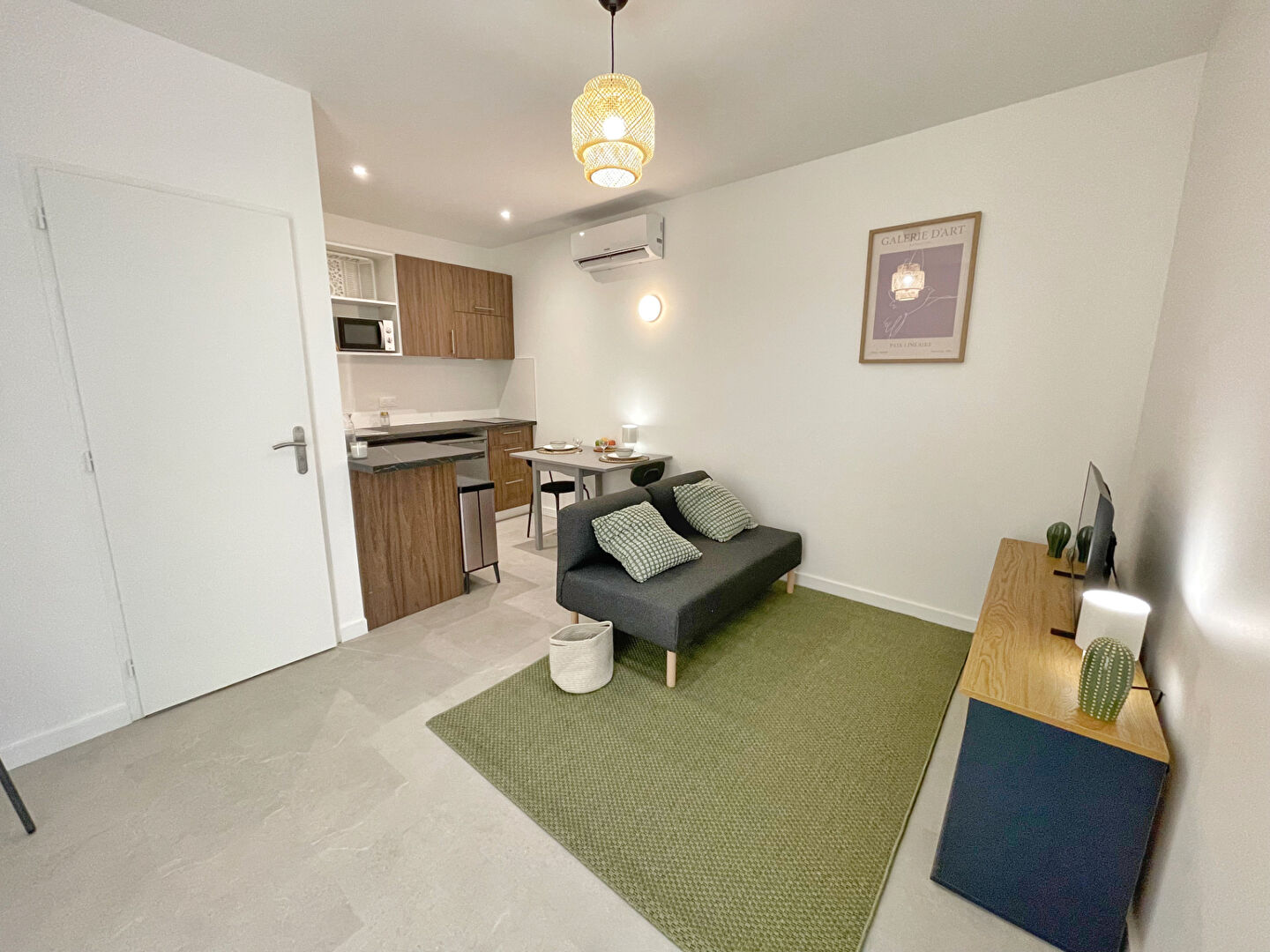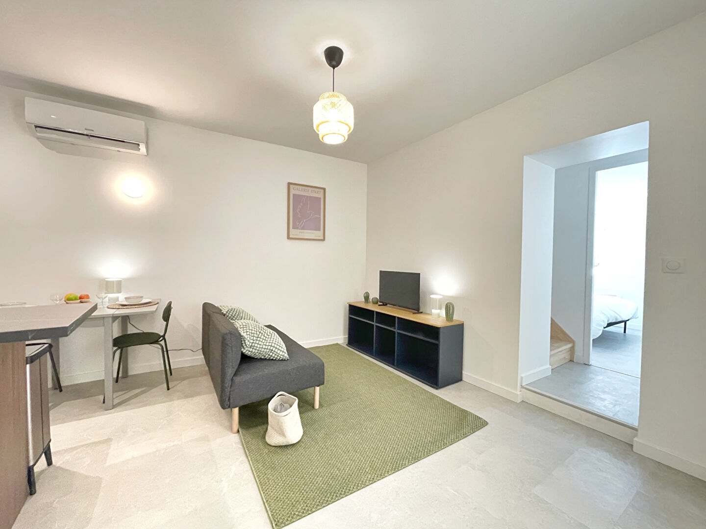 L'appartement offre une belle luminosité et un agencement optimisé, comprenant une cuisine équipée, une salle d'eau contemporaine avec WC, et deux chambres, dont une en mezzanine et bénéficie d'une climatisation réversible.