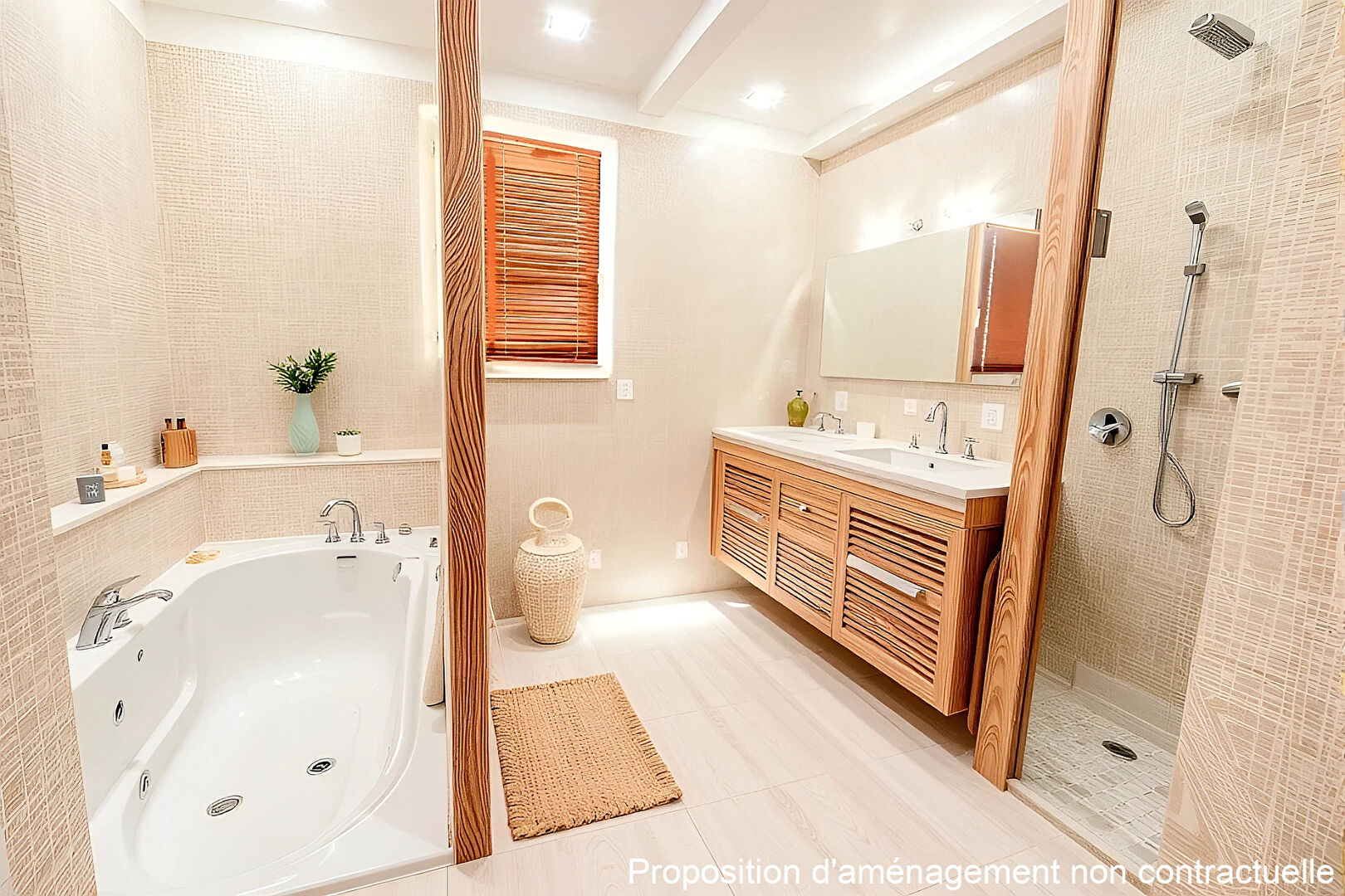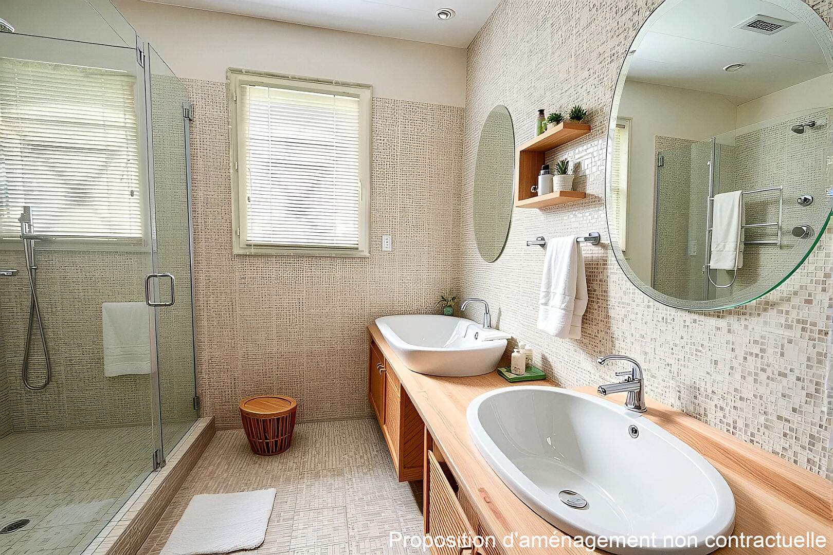 Confort absolu : Une salle de bain et une salle d'eau, chacune équipée d'une double vasque, de placards de rangement, d'un sèche-serviettes, d'une VMC et d'une fenêtre. Deux WC indépendants.