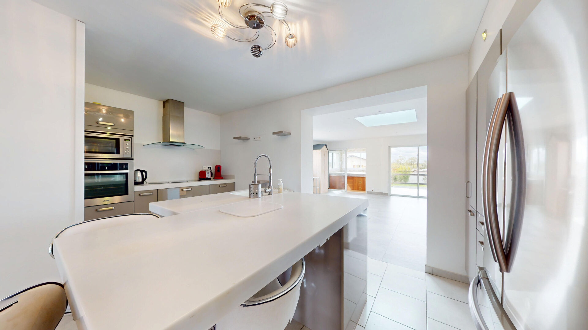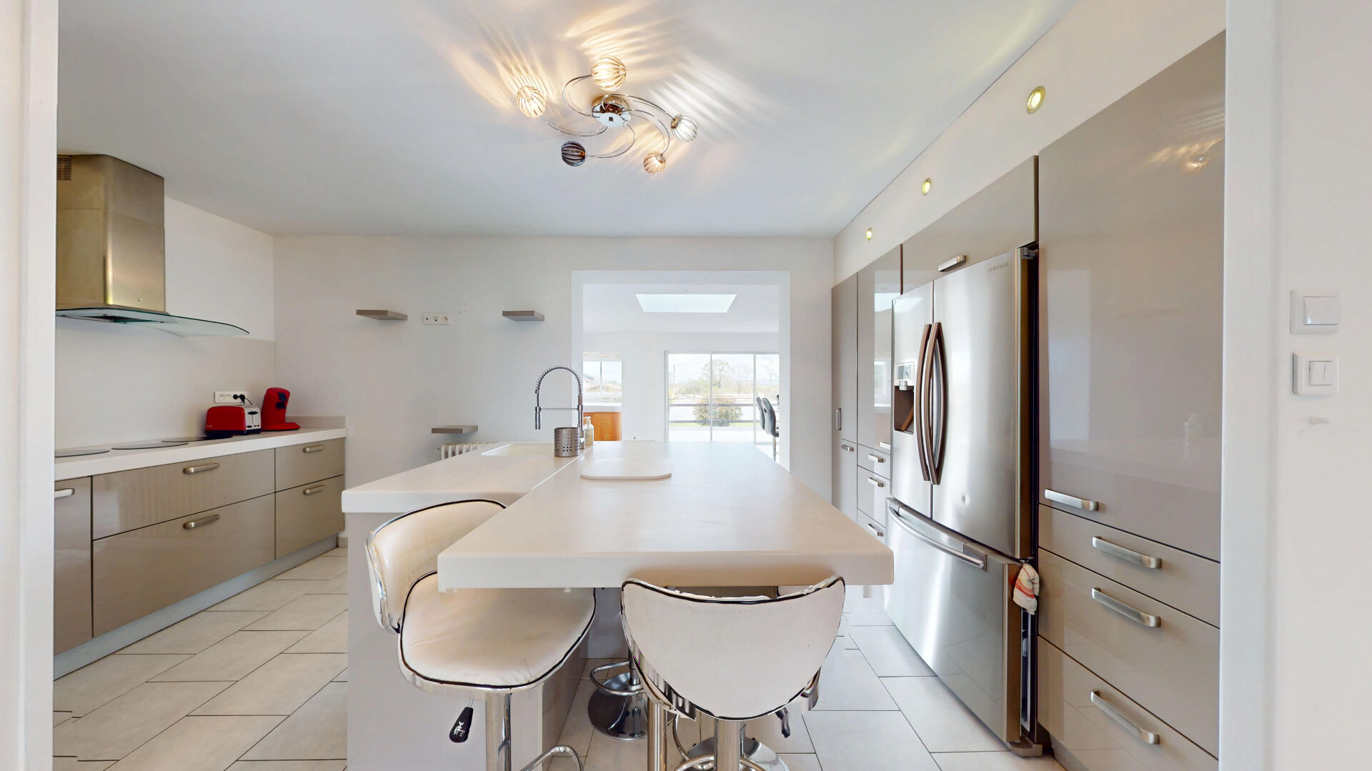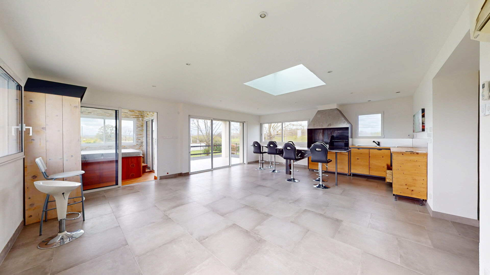 Dès l'entrée, le volume et la luminosité marquent les esprits. L'espace de vie s'organise autour de deux salons ouverts et communicants, développant plus de 70 m². Traversant, cet ensemble profite d'une lumière naturelle tout au long de la journée et crée une atmosphère chaleureuse, idéale aussi bien pour le quotidien que pour recevoir. La cuisine entièrement équipée, ouverte sur le séjour, s'intègre harmonieusement à cet espace convivial, sublimé par la présence d'un poêle qui renforce le confort et l'ambiance.