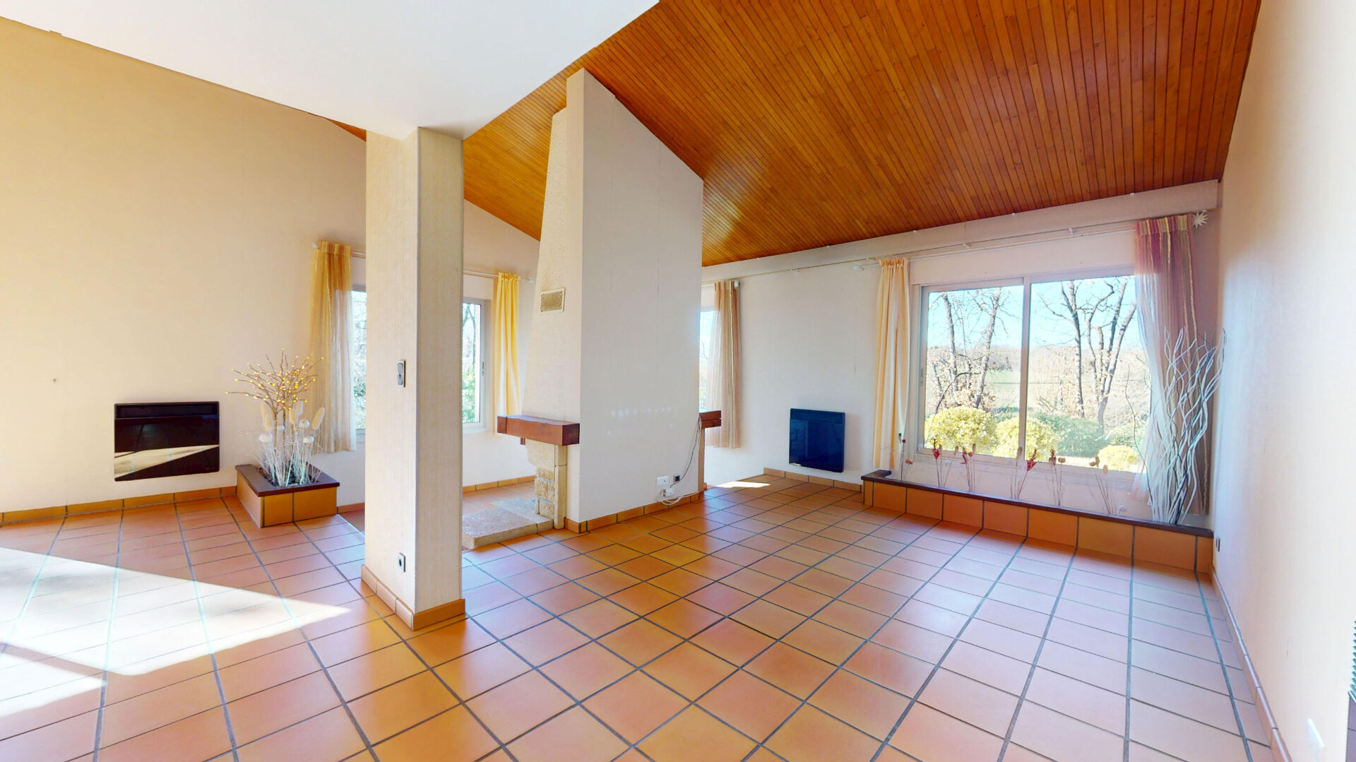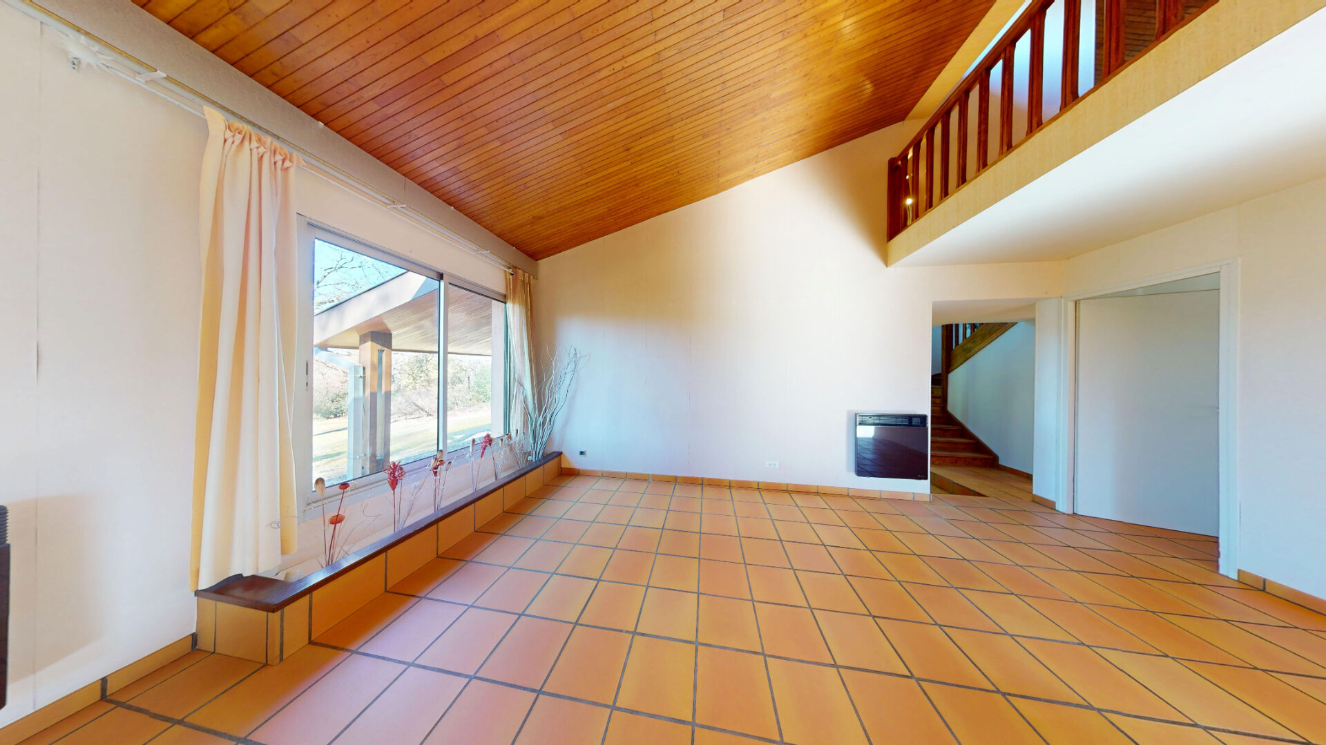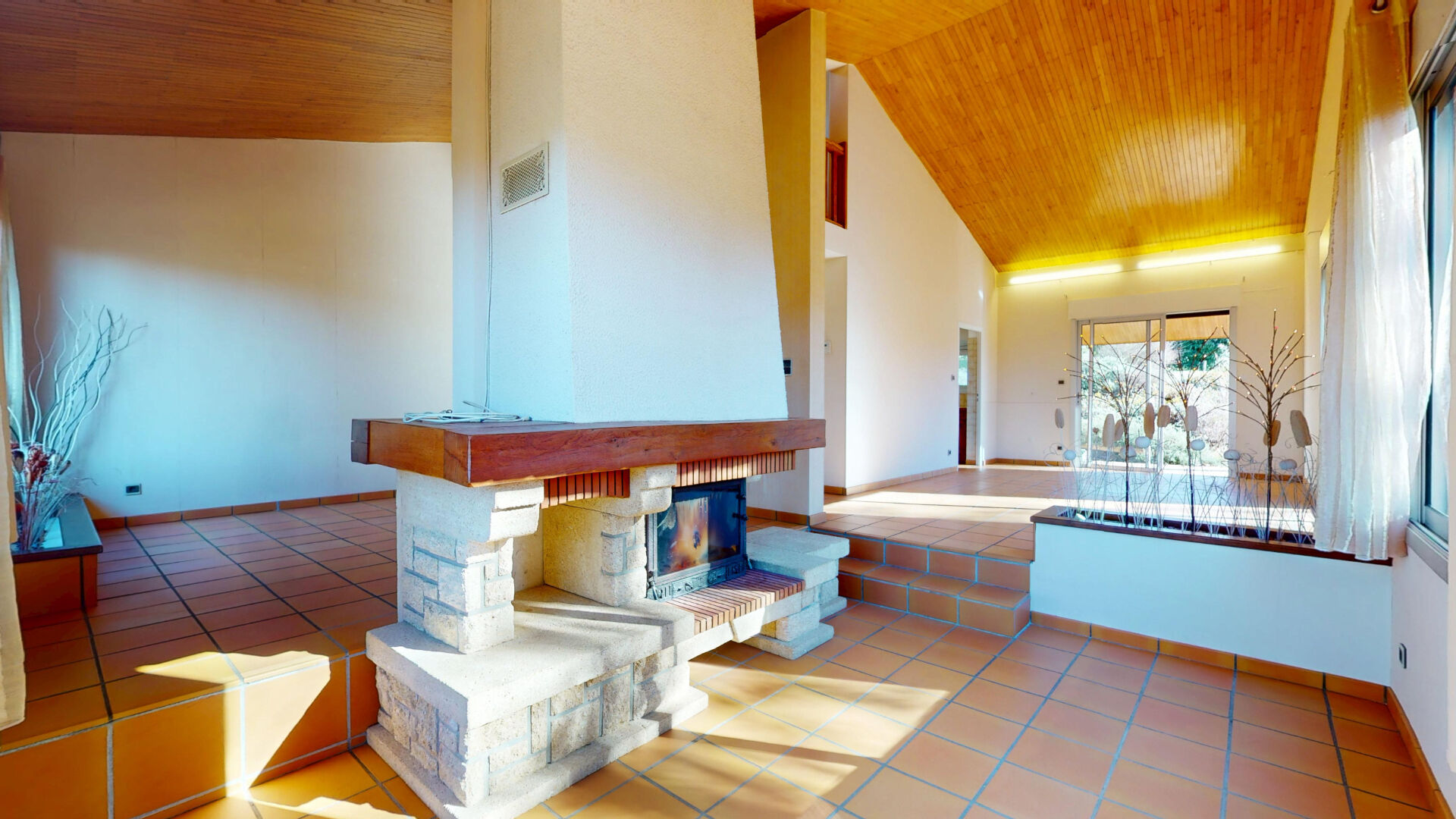 Le séjour de 54 m² impressionne par sa hauteur sous plafond et sa sensation d'espace, sublimée par une cheminée qui invite aux soirées cosy en hiver. De très larges menuiseries vitrées habillent la pièce et inondent l'espace de lumière naturelle tout au long de la journée, grâce à une triple exposition sud-est-ouest tout en offrant une belle ouverture sur le parc.