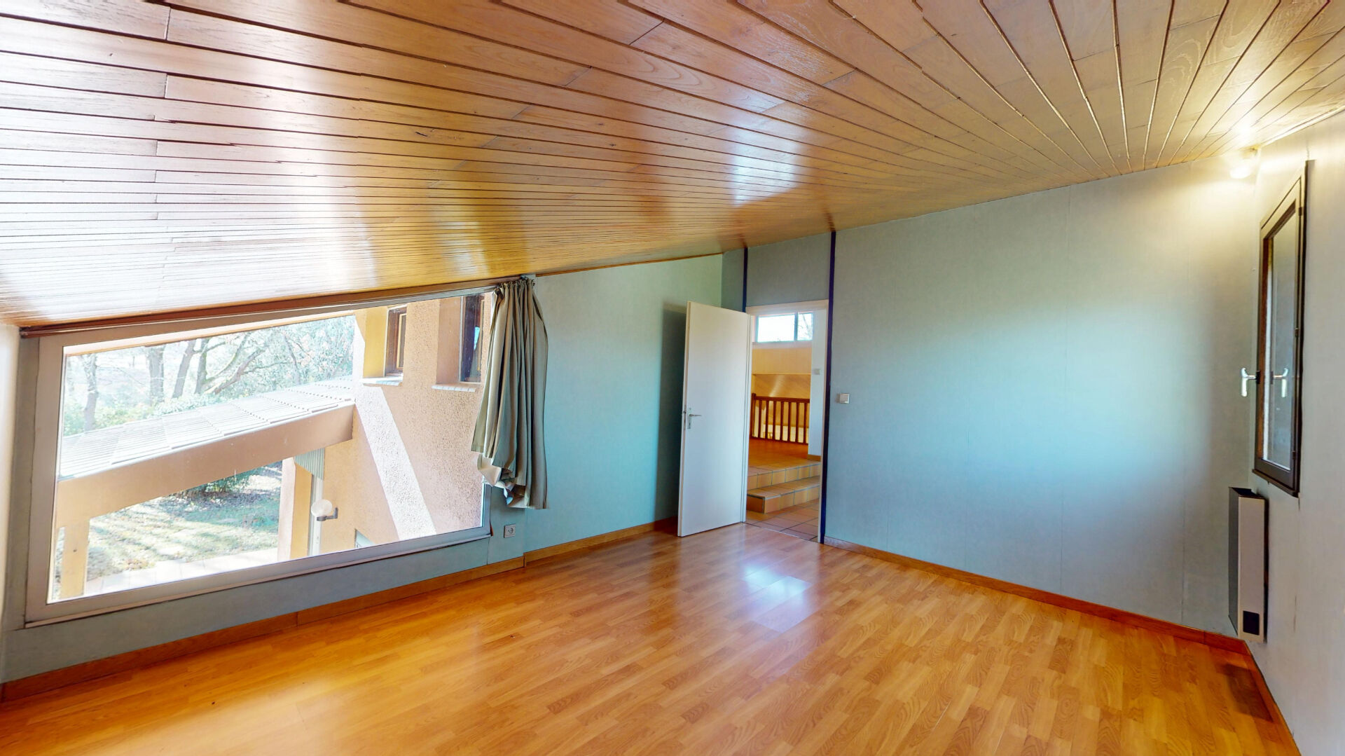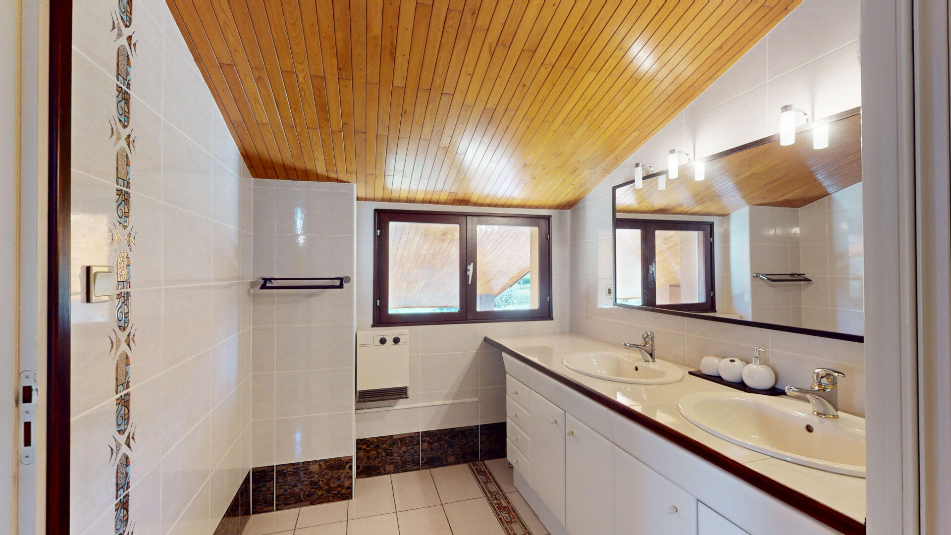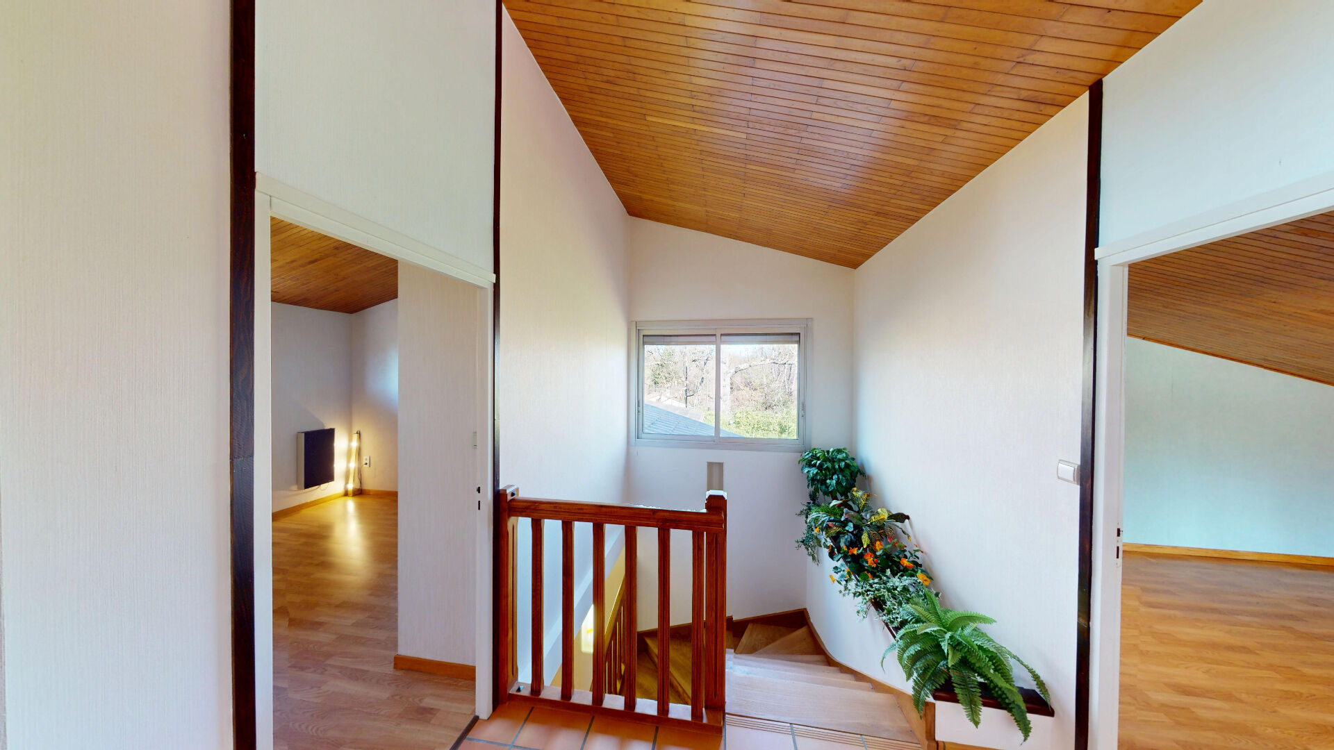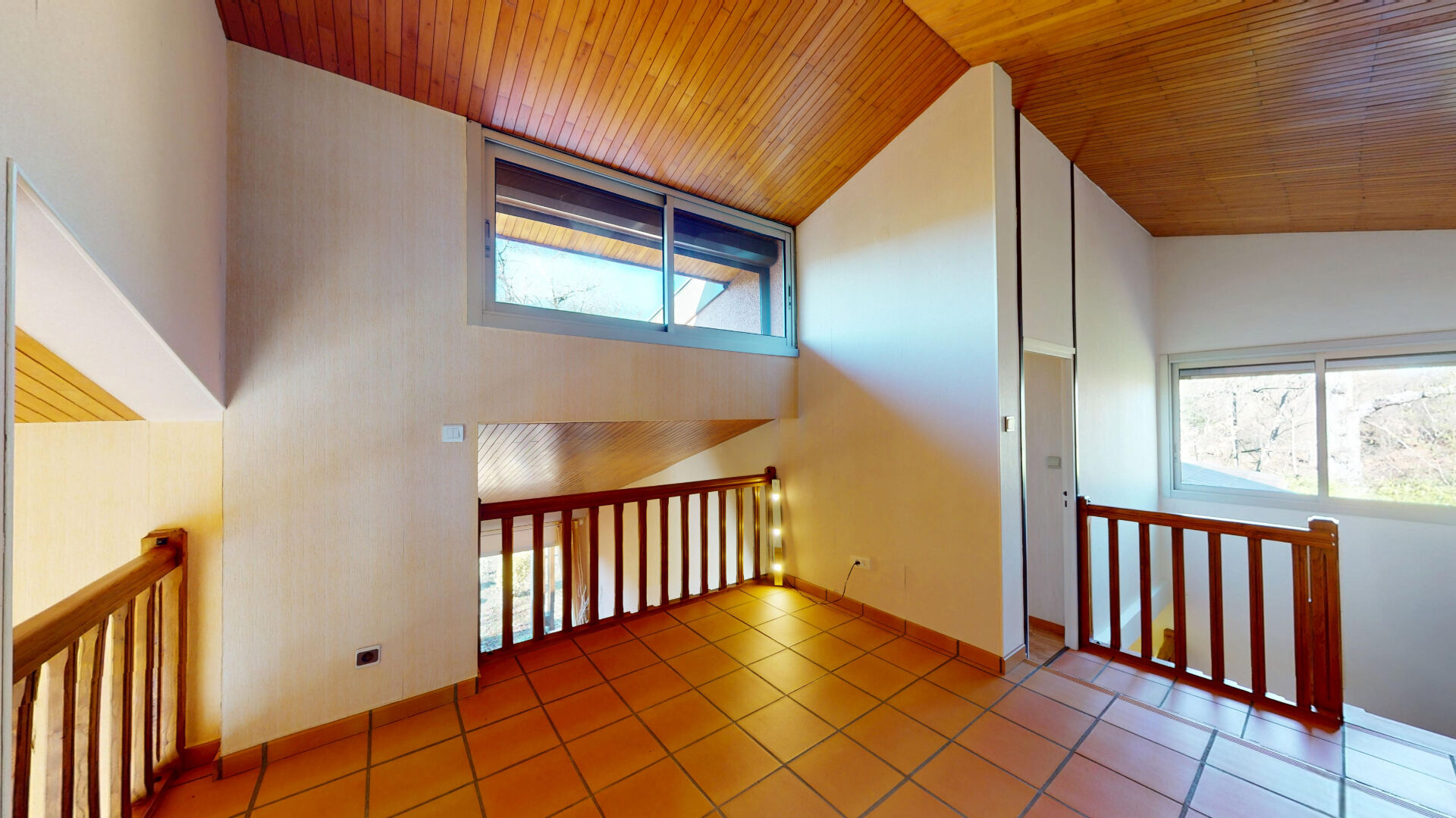 À l'étage, vous trouverez deux chambres, une salle d'eau avec double vasque et cabine de douche, ainsi qu'un espace mezzanine surplombant le séjour, parfait pour aménager un coin lecture, un bureau de télétravail ou un espace détente.