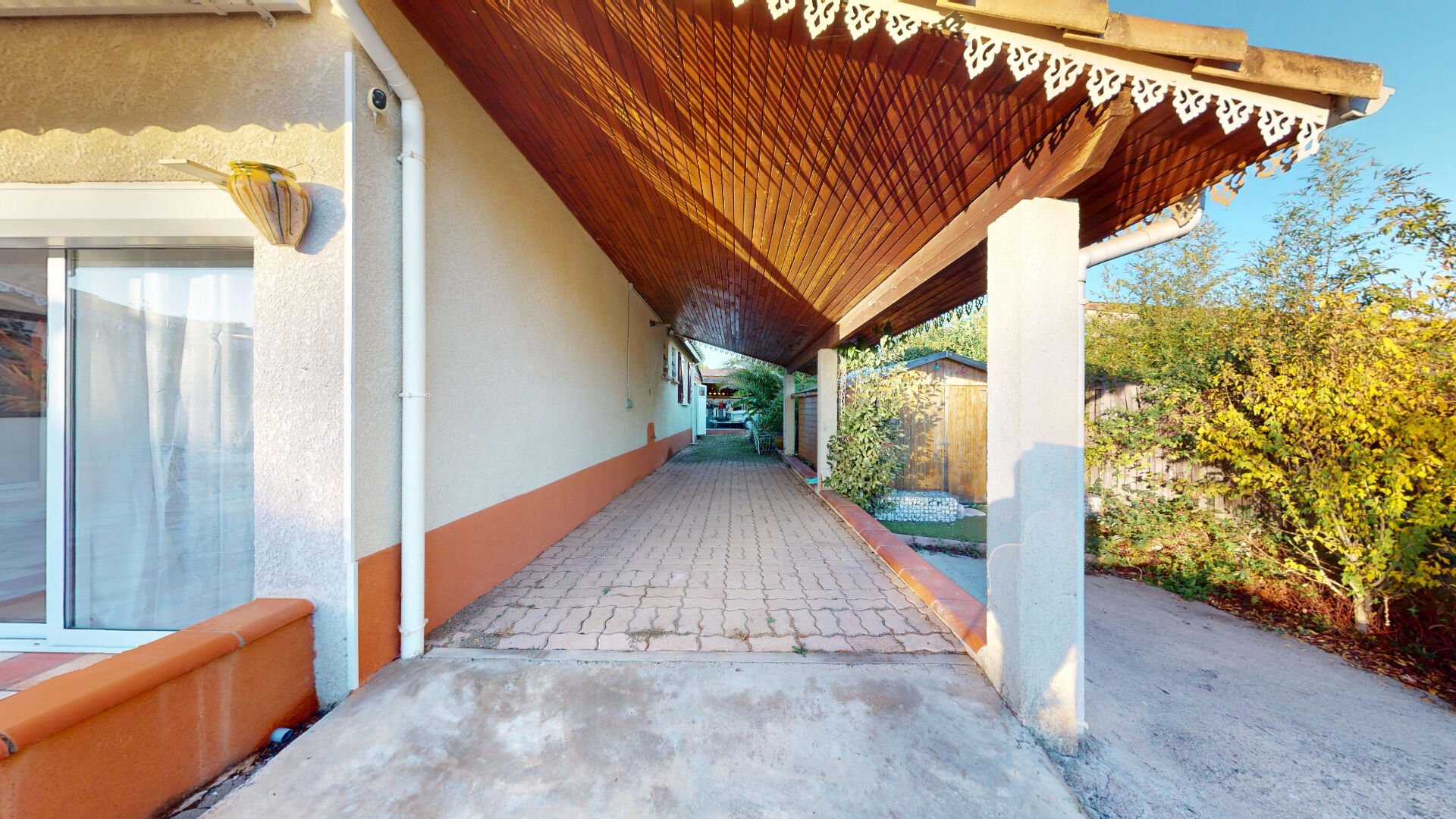 Un grand carport permet de stationner plusieurs véhicules et dispose d'une prise électrique pour voiture, un vrai plus pour les foyers modernes.
