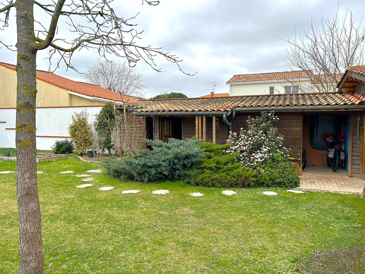 Extérieur parfaitement entretenu : Maison individuelle non mitoyenne sur un terrain de 550m² avec un beau jardin et des cabanons en bois.