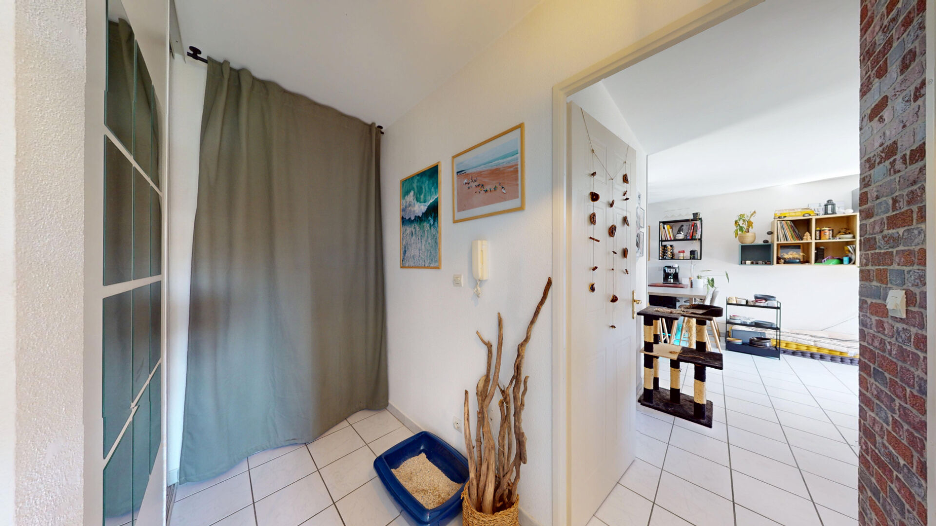 Un cellier pratique, abritant le lave-linge et le chauffe-eau, complète intelligemment le logement en offrant des rangements supplémentaires très appréciables.