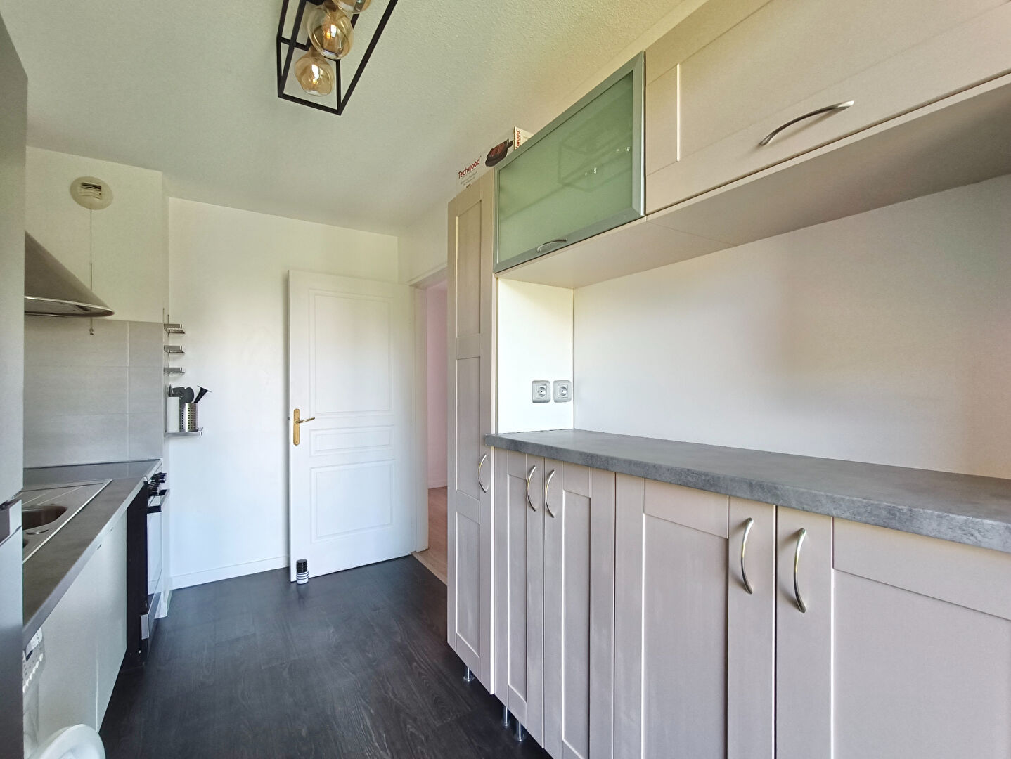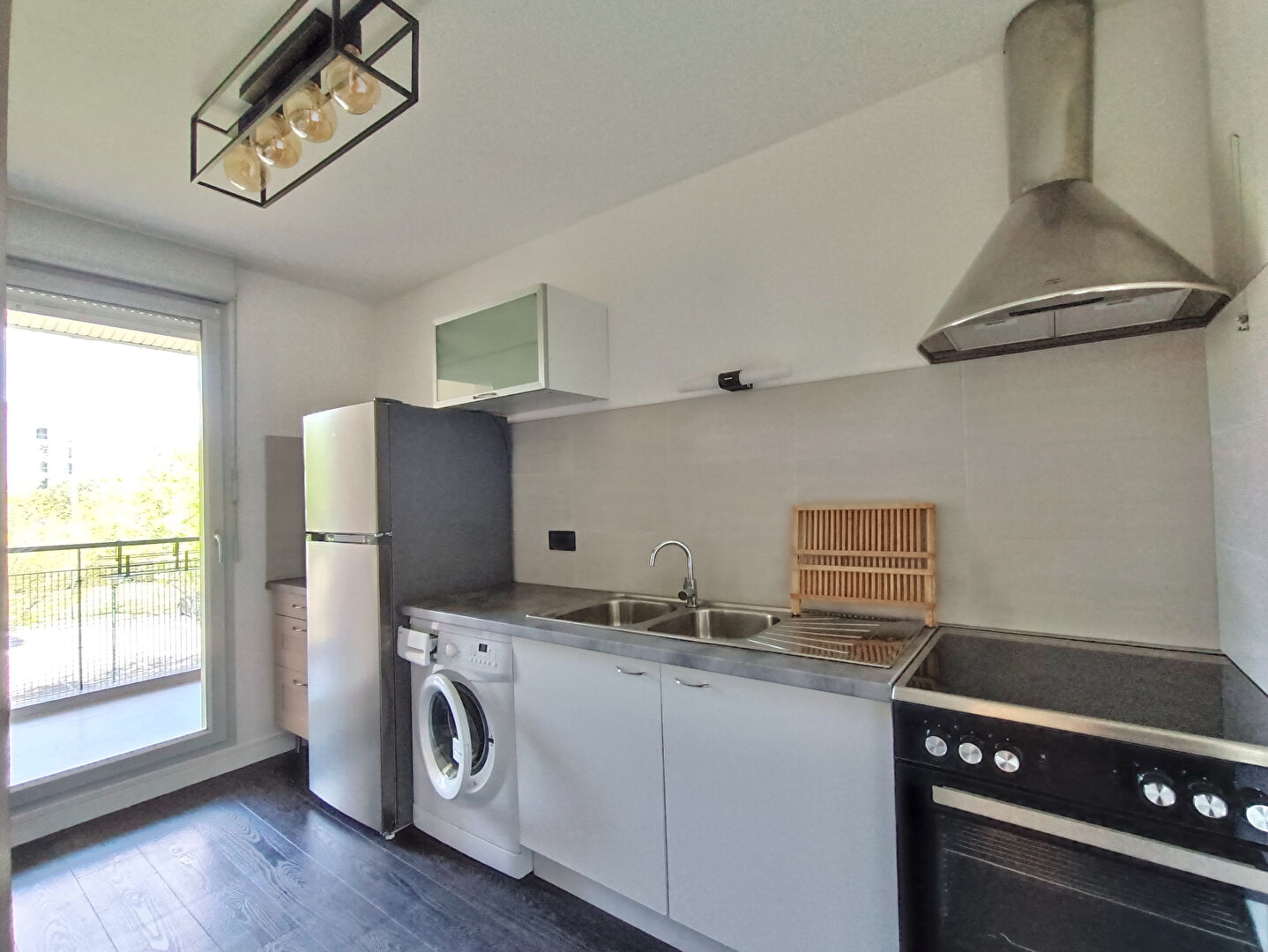 La cuisine est entièrement meublée et équipée : placards de rangement, gazinière électrique avec four et plaque vitro-céramique, hotte aspirante, réfrigérateur avec congélateur, micro-ondes, lave-linge.