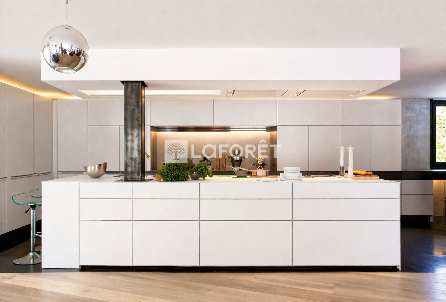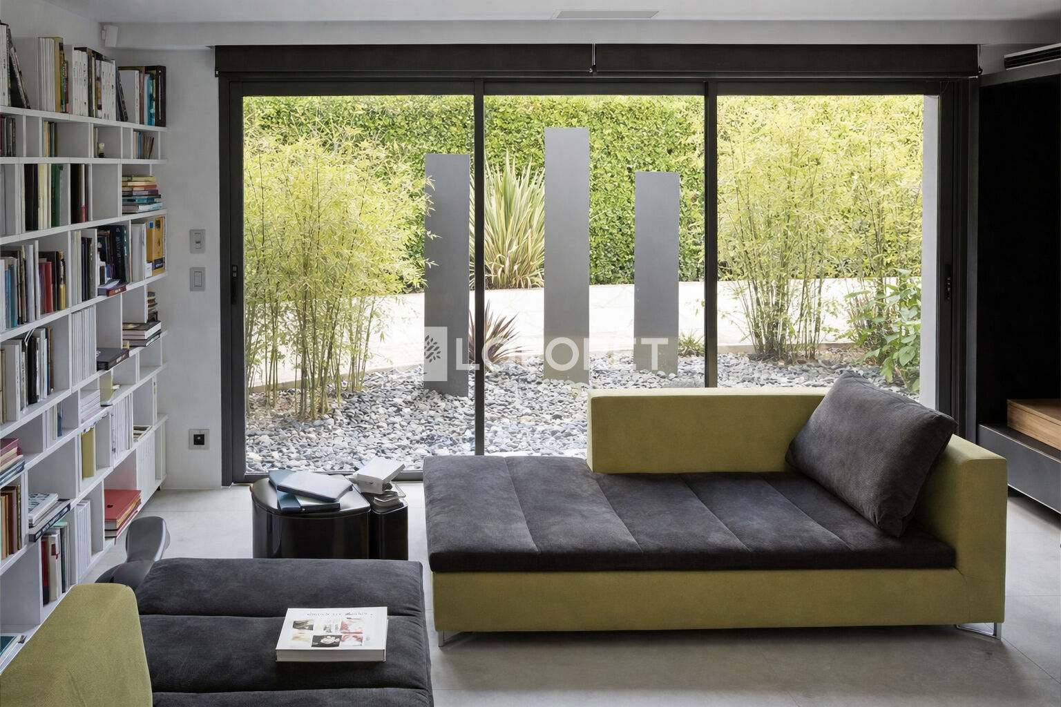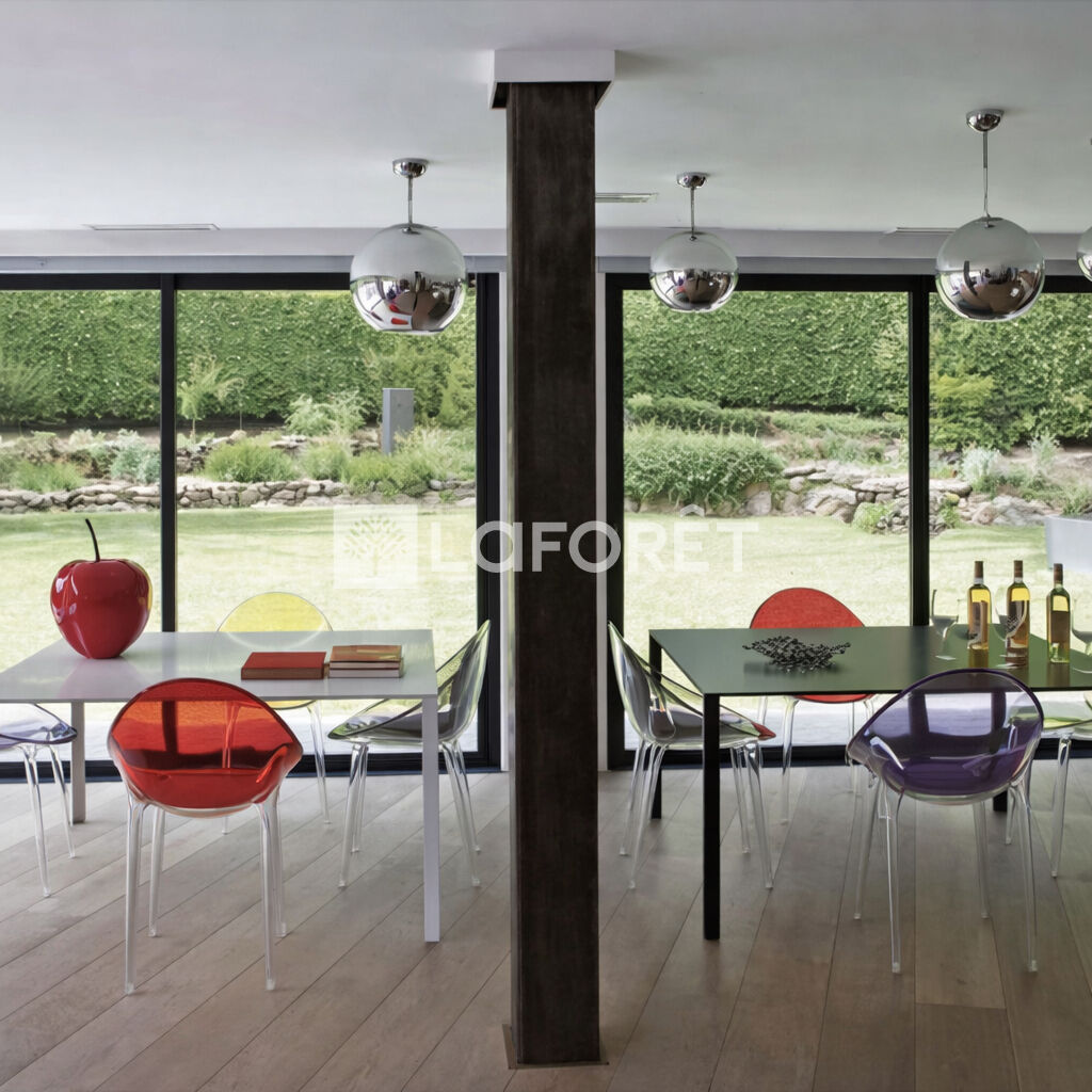 Le séjour, largement vitré, s'ouvre directement sur le jardin et les terrasses. La cuisine, ouverte, s'organise autour d'un îlot central.