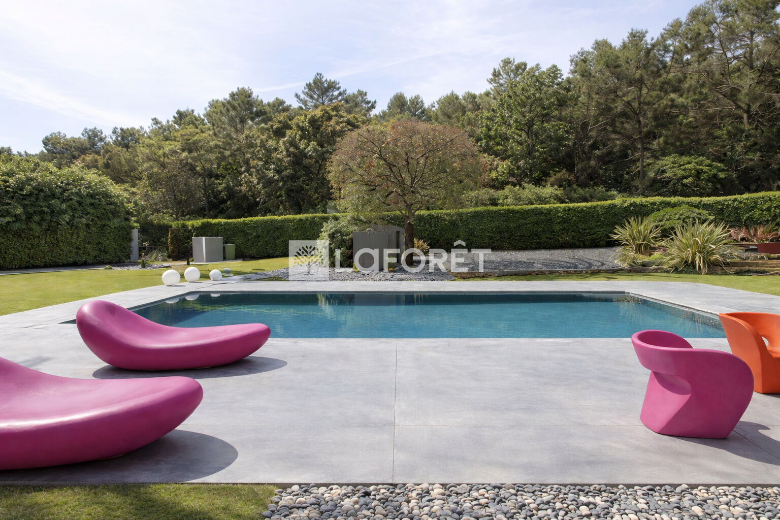 À l'extérieur, piscine, terrasses et jardin structuré.