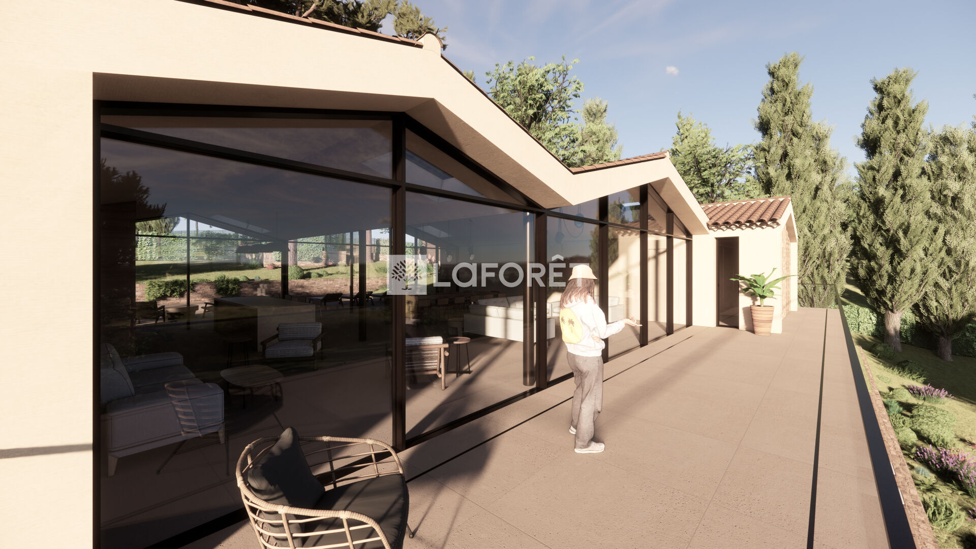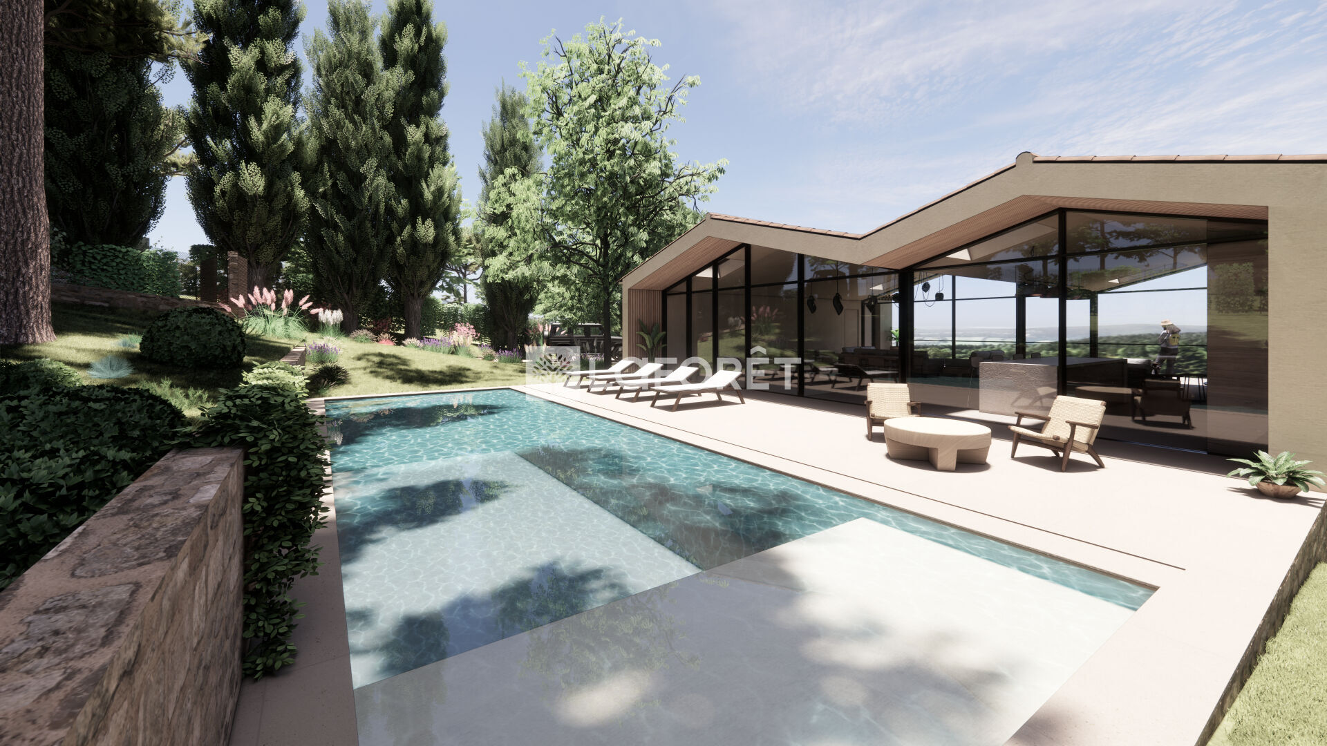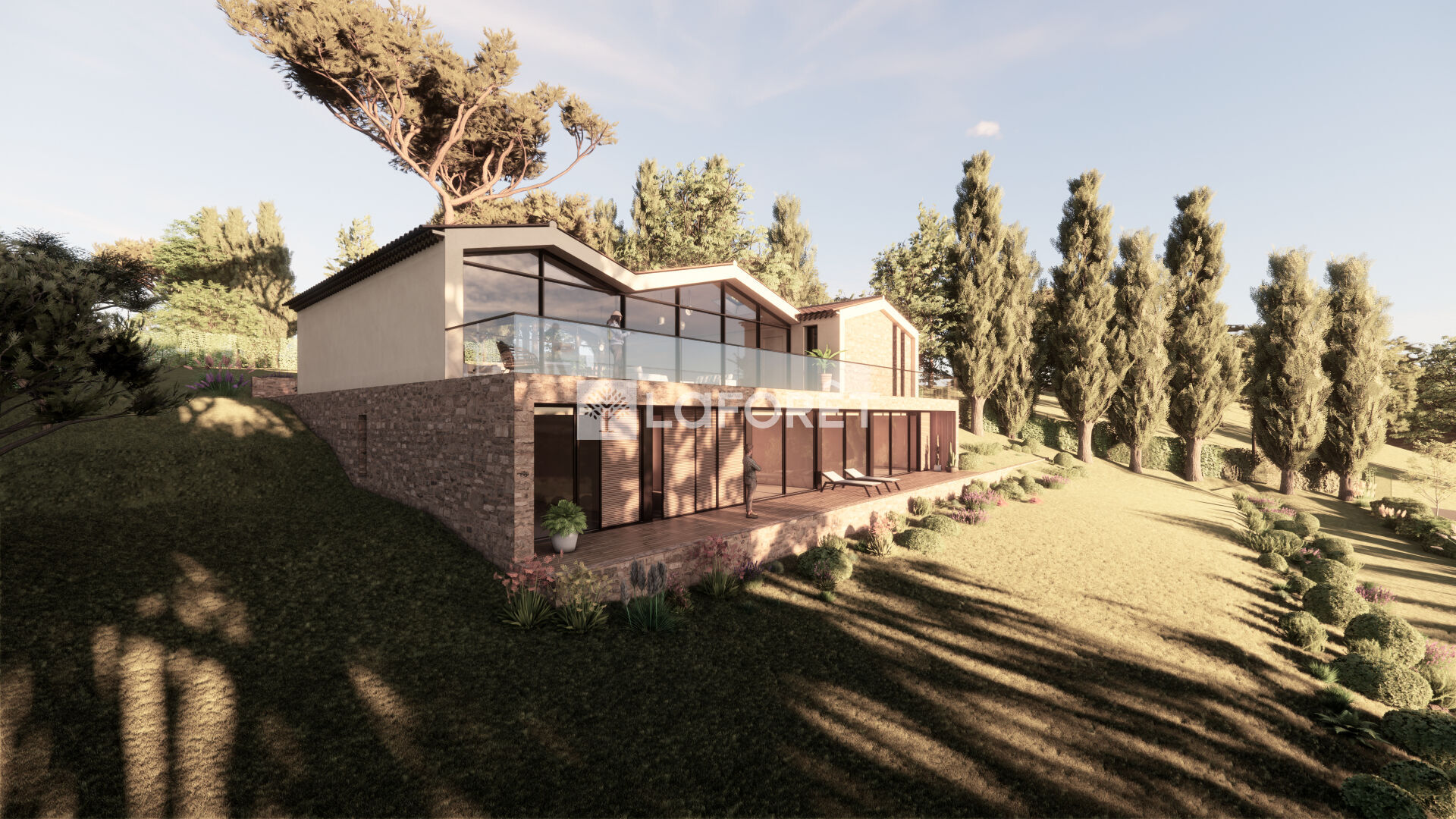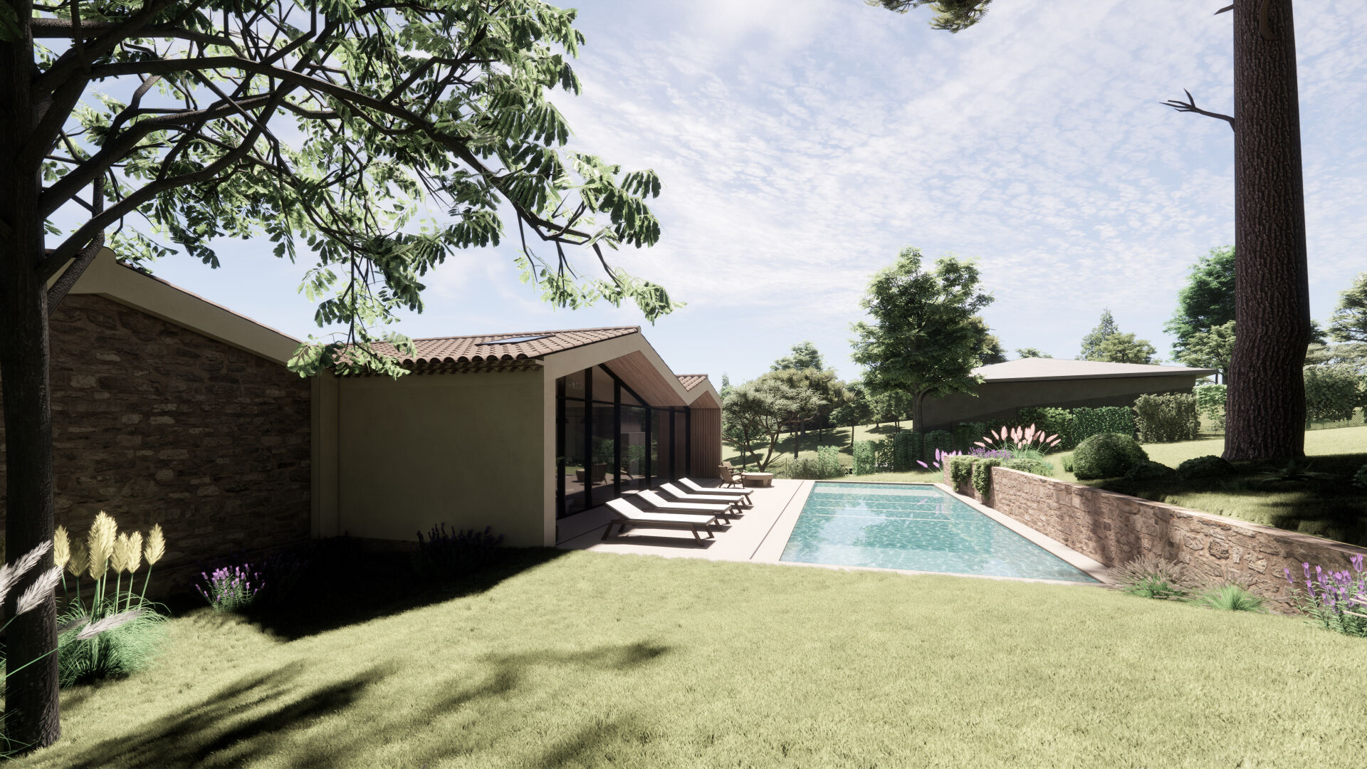 La villa imaginée allie modernité et tradition, avec ses volumes généreux, baies vitrées, tuiles provençales et une intégration parfaite dans le paysage :